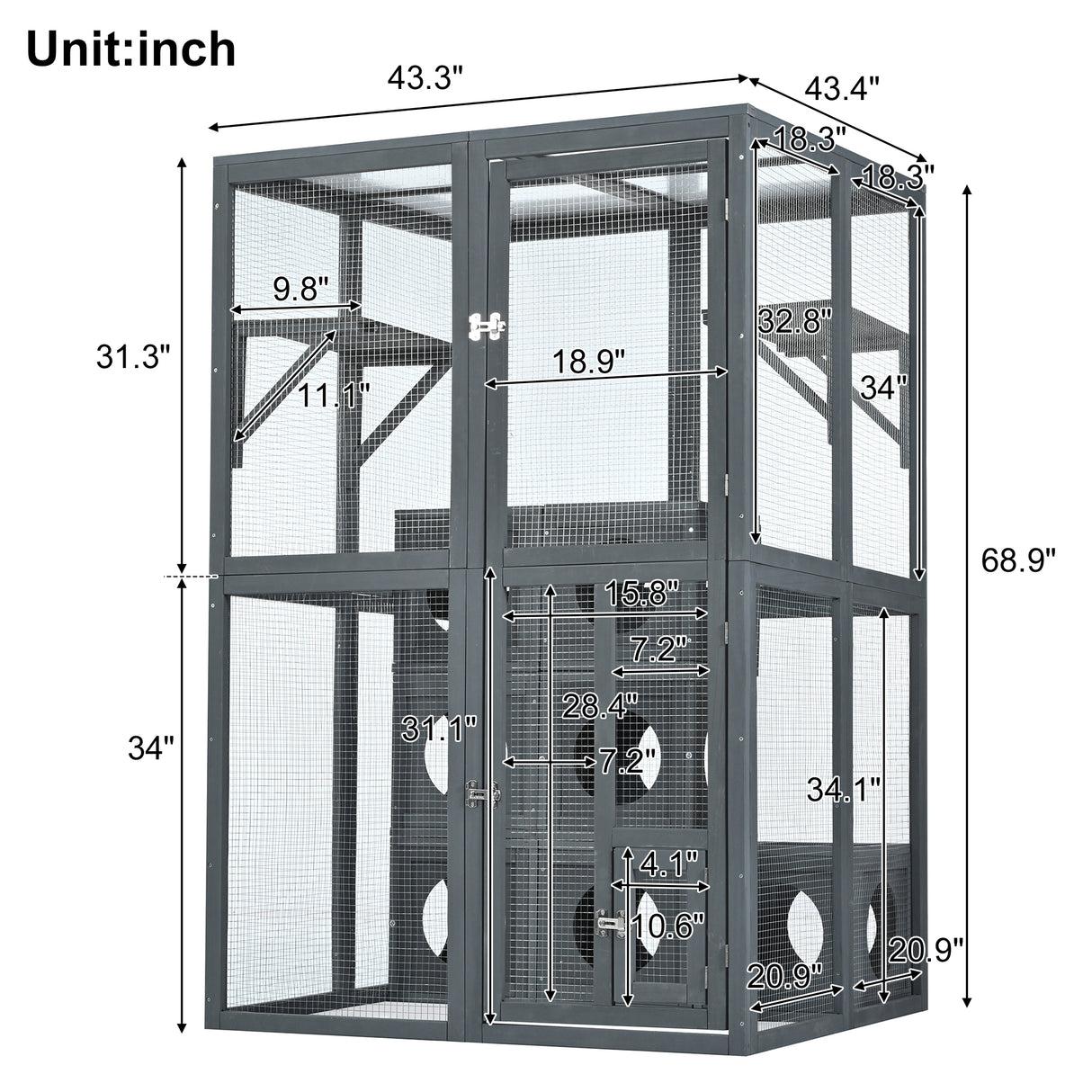 - Size & Structure: Measuring 43.3'L x 43.4'W x 68.9'H, this outdoor catio offers a spacious, multi - level play area. The tall 69' main door lets you enter easily for interaction, feeding, and cleaning, while the corner cat - sized door provides a secure entry for your feline friends. Its compact footprint fits well in backyards, gardens, or patios, creating a private outdoor haven for cats.