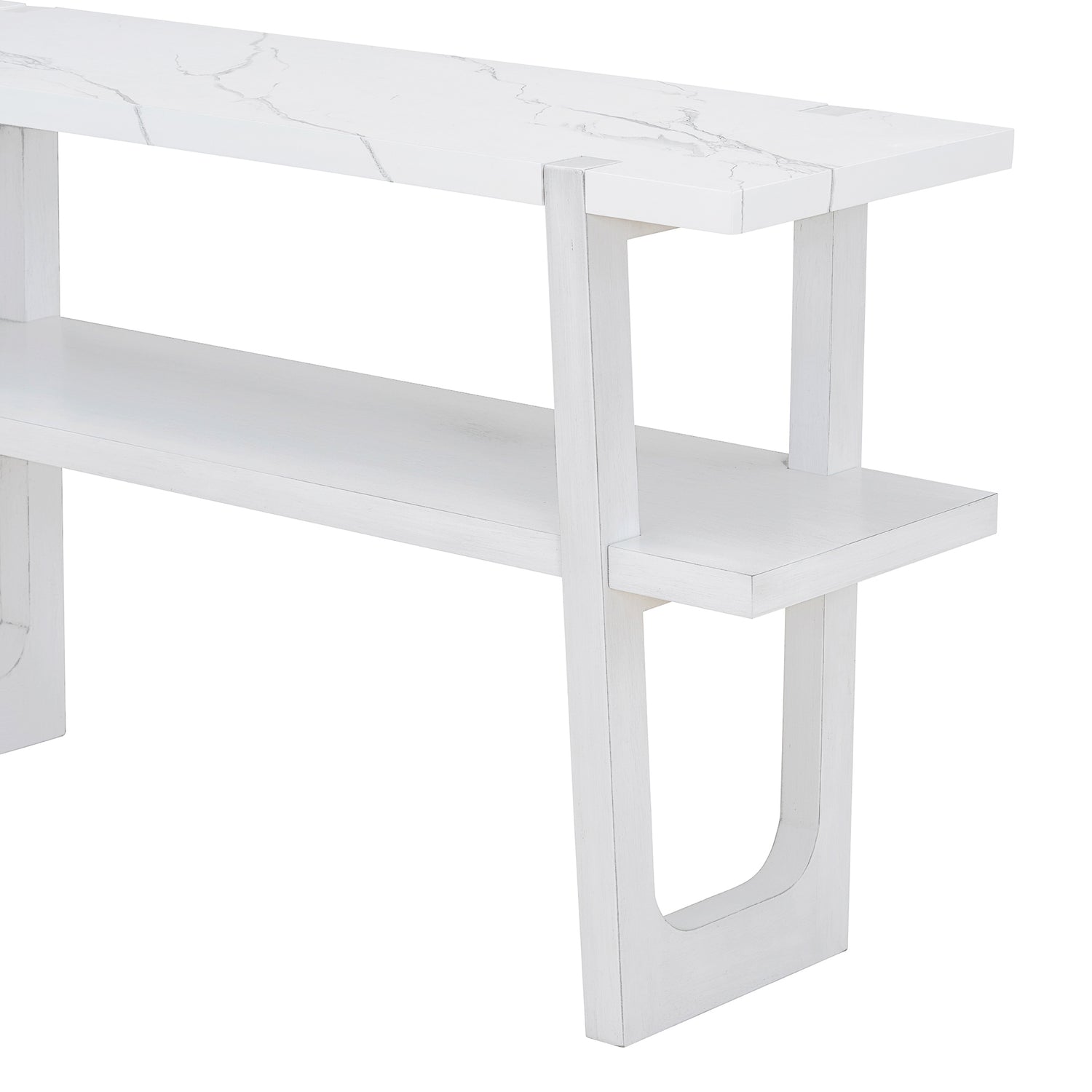 - Eye-Catching Design: This narrow console table features a unique and eye-catching design that combines modern minimalism with artistic flair. The top surface is complemented by a sleek marble-effect sticker, while the lower shelf is integrated into the frame. The cut-out details in the legs add a sculptural quality to the entryway table, making it a standout piece in any space. This design not only enhances visual appeal but also maximizes both stability and storage potential of this sofa table.