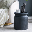 Boasting a round, sculptural silhouette, a sleek black hue, and subtle grain details, this decorative side table is sure to infuse your home decor with a profound touch of nature. Standing 16 tall with a 14 diameter, it will thrive as a nightstand, chairside accent table, end table, or even as a pedestal for potted plants and colorful displays.