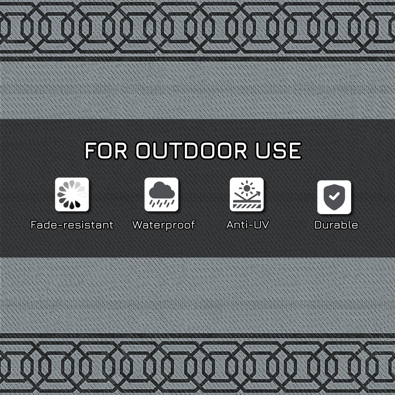 Elevate your outdoor space with this reversible black and grey patio rug, combining style, convenience, and durability. Lightweight and designed for easy transport, it's the perfect companion for RV trips, camping, or backyard relaxation.