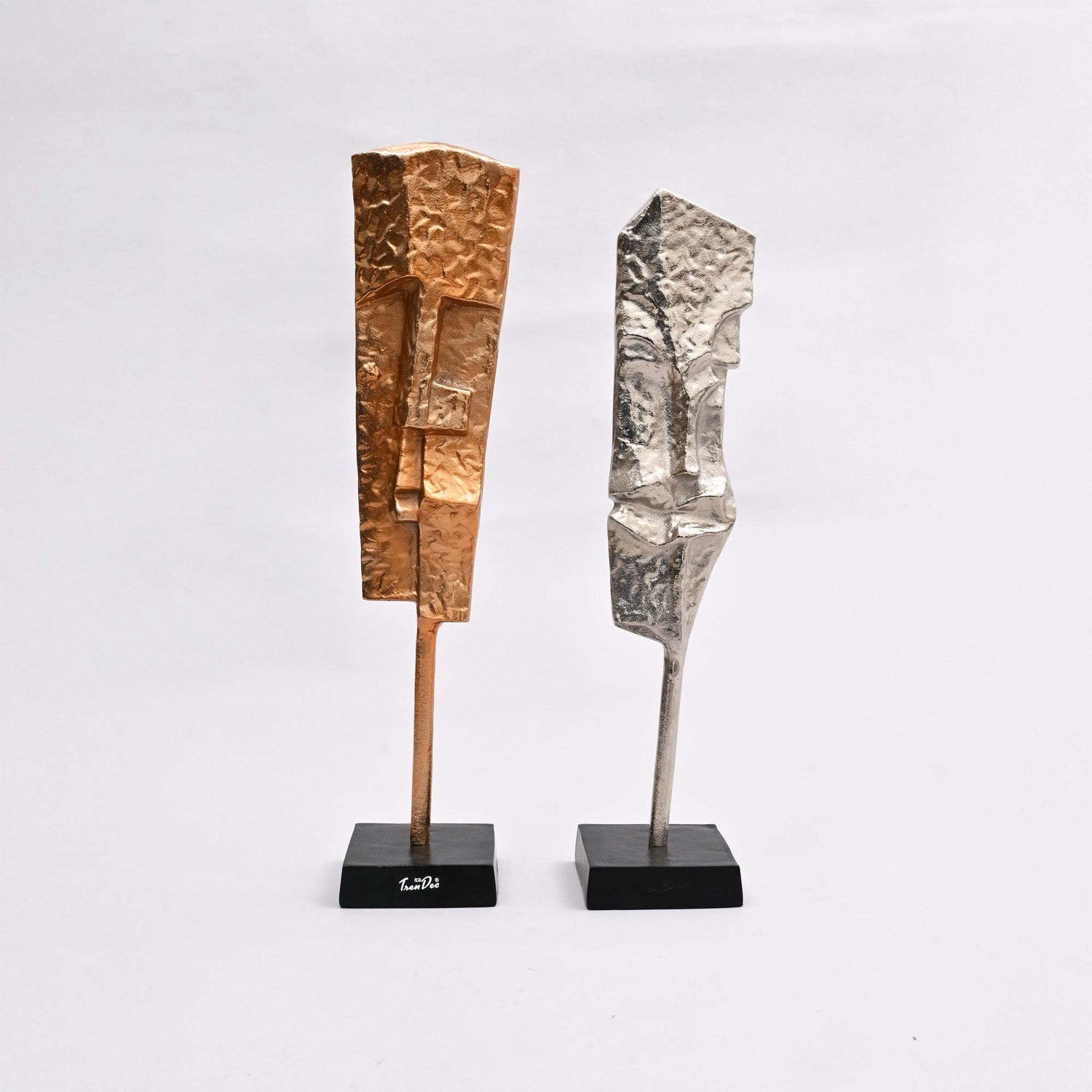 - Elegant Finishes: One sculpture in polished gold, the other in polished nickel – both with black bases
