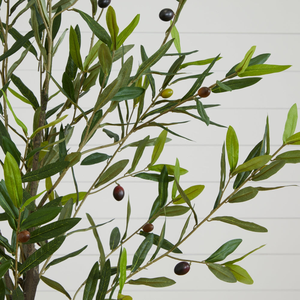 Walk through the Italian countryside with this fine and delicate Olive Artificial Tree. Featuring a thin brown trunk that splits into stems, this fake tree elegantly displays faux leaves and is accented throughout with fake olives so realistic that you’ll want to eat them. Standing 6' from a nursery planter (included in height), curate in compact and tight spaces like apartments, awkward corners, and bathrooms. This best-seller is perfect for minimalist, mid-century modern, boho and homes that need a delicate touch.