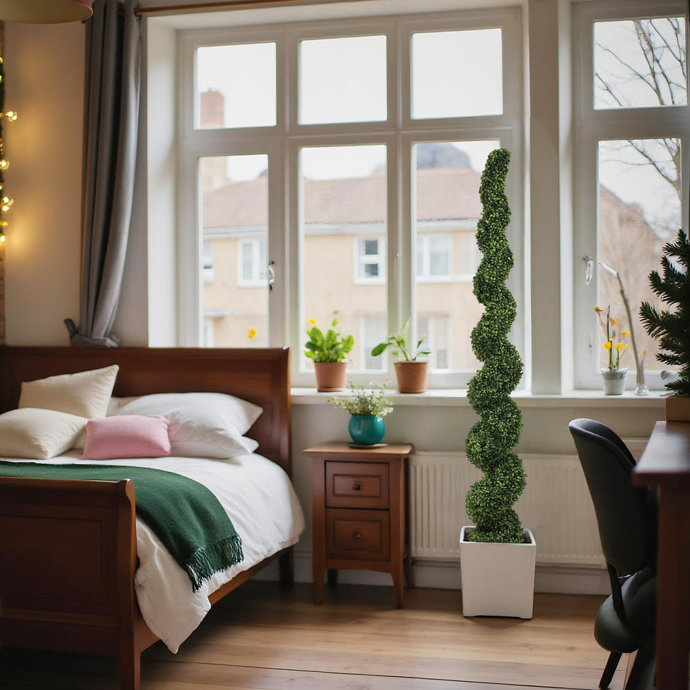 These 7-foot tall spiral topiary trees are artificial faux boxwood plants designed for outdoor use. They enhance gardens, terraces, and entryways with natural-looking greenery and an elegant twisted design.
