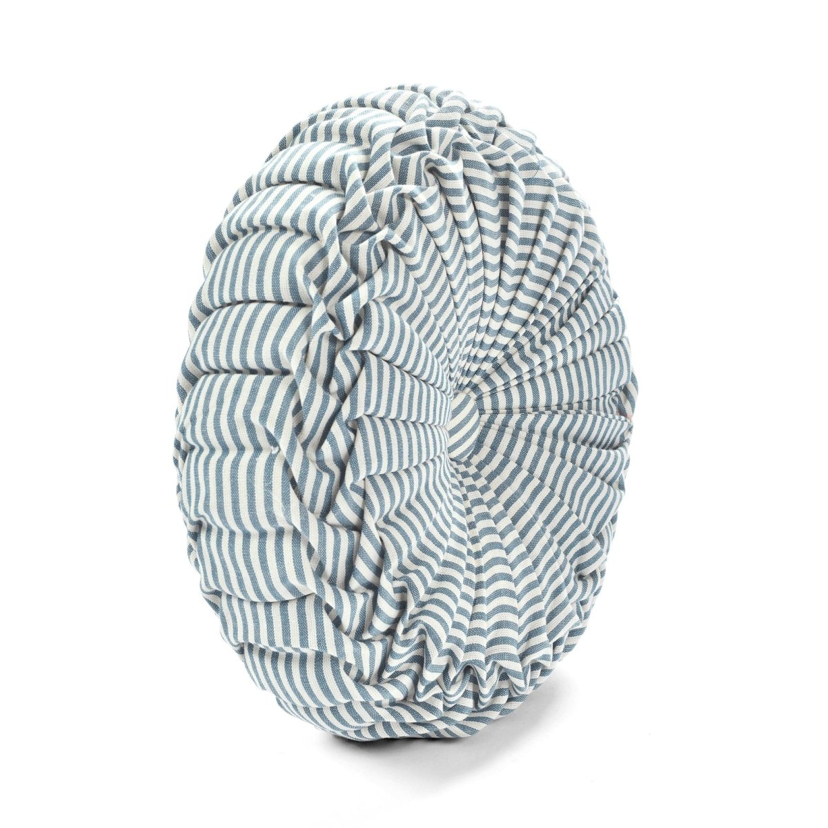 This circular accent pillow measures 14 inches in diameter. This Farmhouse Ticking Stripe Yarn Dyed Pleated Decorative Pillow is a standard size that is large enough to make an impact on your design but not so big that it will take over the look of the room.
