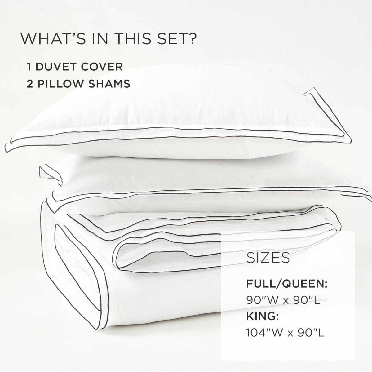 Our 3-piece Hampton Double Flange Embroidered Contrast Edge Duvet Cover Set includes 1 duvet cover and 2 king pillow shams. Add your favorite insert weight or change it seasonally for year-round comfort tailored just for you. Easily secure your insert inside the duvet cover with the button closures and the four internal corner ties.