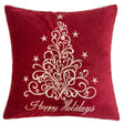 A festive accent of elegance and comfort, this plush velvet pillow brings warmth and refinement to holiday décor. Its rich red cover is adorned with gold-embroidered stars, a stately Christmas tree, and the welcoming script of “Happy Holidays,” making it a timeless seasonal statement piece.