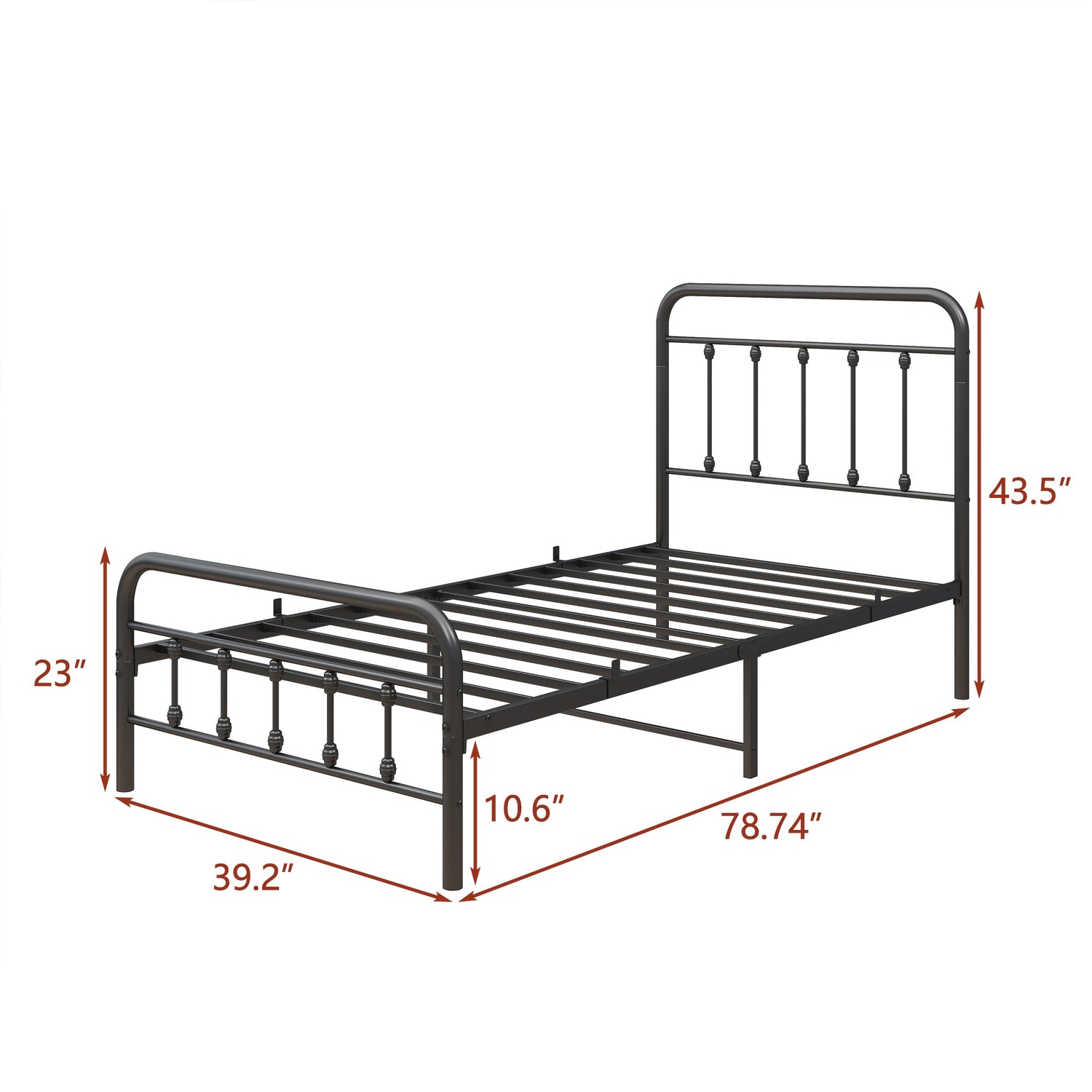 This queen-sized metal bed frame blends timeless Victorian elegance with the uncompromising strength of modern craftsmanship. Constructed entirely of reinforced steel, it supports up to 450 lbs with ease while remaining exceptionally quiet and stable. Thirteen sturdy slats and nine center legs provide superior mattress support, eliminating the need for a box spring while extending mattress life.