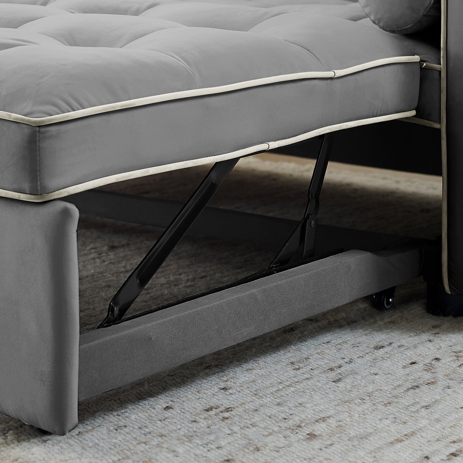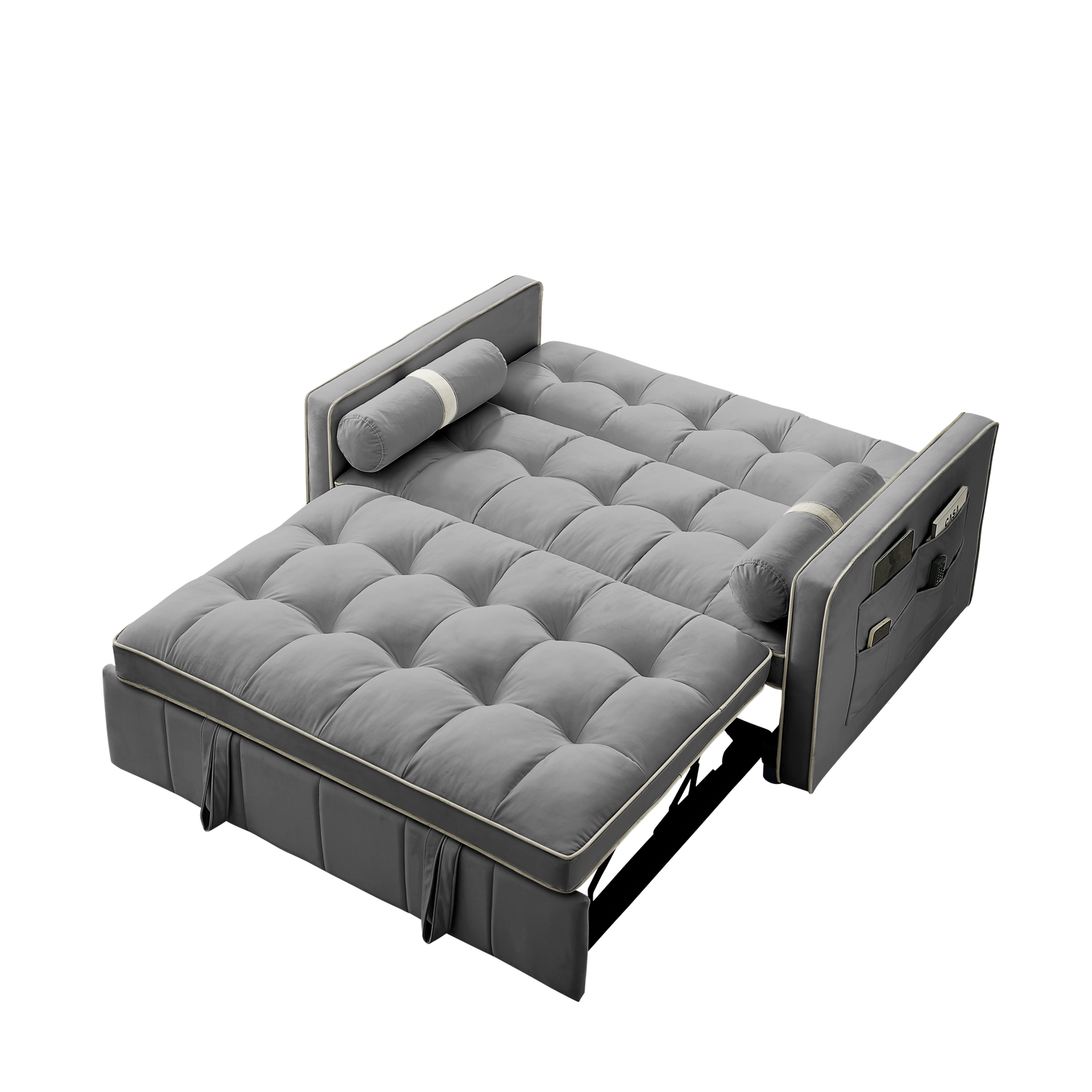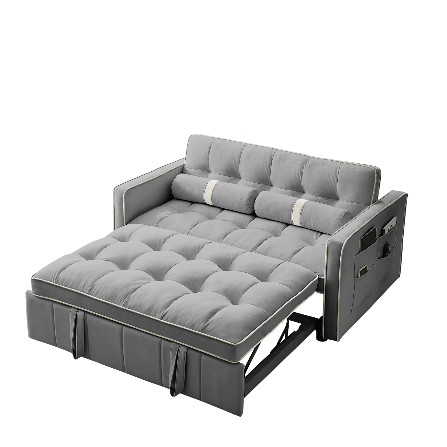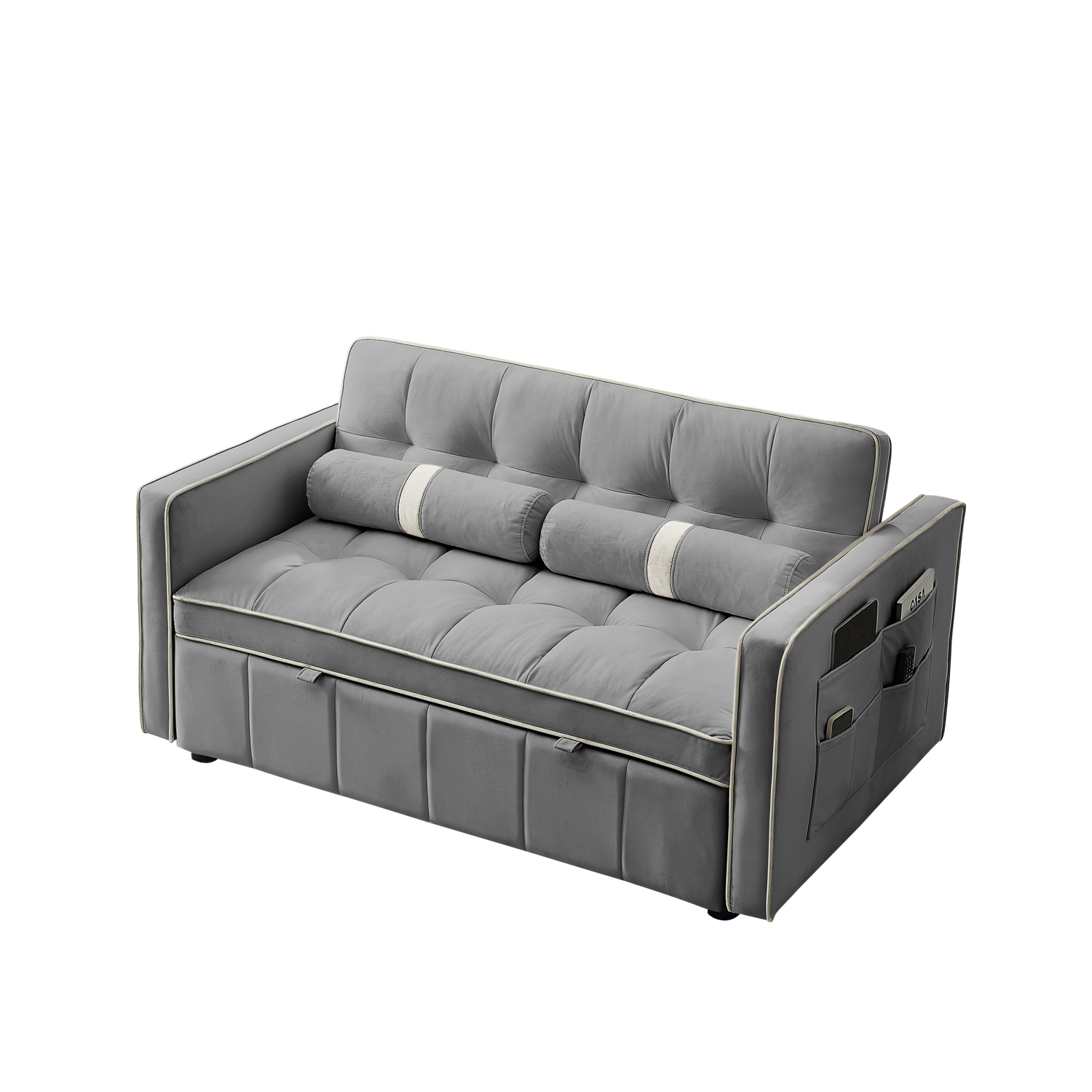 1. Multifunctional pull-out sofa bed. By pulling out and lifting the bed frame under the seat and lowering the backrest, this double position sofa can be quickly converted into a bed for resting use. 2. Adjustable and super strong: soft high-grain velvet fabric and high-density foam, the backrest can be adjusted to 3 positions, 105°-180° recline or lie flat, it can be used for listening, playing games, reading, and sleeping. It will make you feel relaxed and comfortable. 3. Suitable for any scene: this multifunctional pull-out sofa bed can be placed in living room and bedroom, it can accommodate 2 people to watch TV, play games or read, it can be used for guests or children's bed, modern design and space saving. This is definitely a good choice for applicable small rooms, apartments, studios, offices. 4. Perfect function: it has two straps to assist pull out can quickly turn the sofa into a bed. Pull-out with a bed made of high quality foam and metal iron frame can steadily support you to lie on the bed. 5. storage pockets and soft pillows. Our sofa comes with two side storage bag for you to reach and use to store your TV remote, cell phone, glasses or books. Also includes two soft pillows for added back support or sleep. 6. Easy to assemble and use. Easy-to-follow instructions ensure the perfect build and pull-out recliner setup is quick and easy. If you need a video, please contact me.