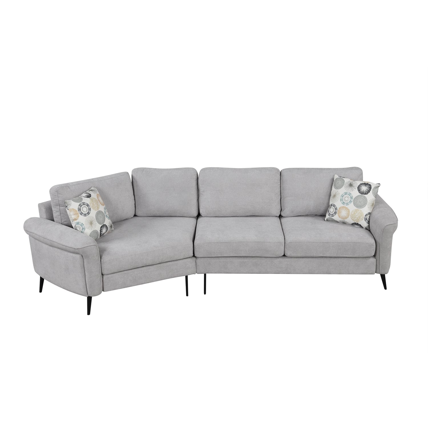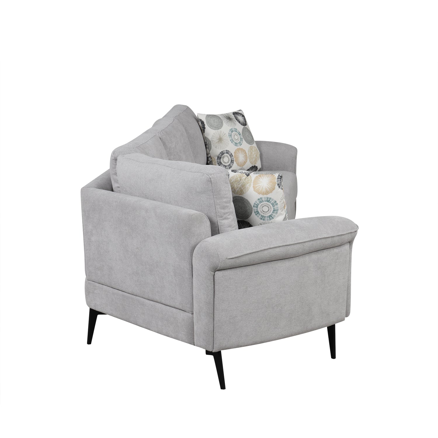 This three-seat sofa offers a perfect combination of style, comfort, and functionality. Its ergonomic armrests are thoughtfully designed with a gentle curve to match the natural contours of the body, ensuring superior support and relaxation. The sleek, curved design adds a touch of elegance and promotes a more relaxed seating posture. Durable metal legs provide sturdy support while elevating the sofa for a light and spacious feel, complementing its modern aesthetic. Additionally, the sofa comes with two removable patterned pillows that enhance its visual appeal and offer practical versatility, as they are easy to clean or swap out for a refreshed look. This sofa is an ideal choice for those seeking comfort, durability, and timeless elegance in their living space.