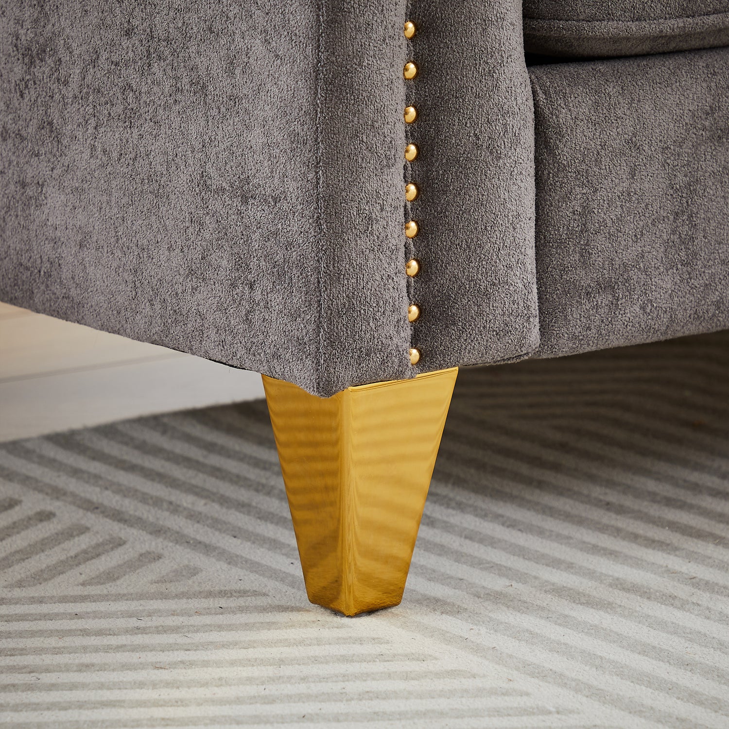 Sofa fabric: chenille Seat leg material/color: gold metal leg/golden Seat cushion material: foam Frame material: artificial wood Seat frame: solid wood Pillows included: 2pcs Weight capacity: 500 lbs Package quantity: 2 boxes Installation Required: Required Installation Difficulty: low The cushion is compressed, please wait 72 hours for the cushion to recover. There may be a slight color difference due to different monitors.