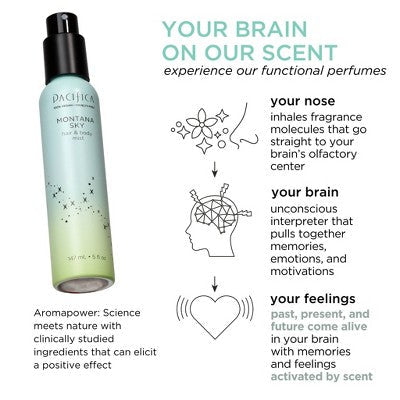 Montana Sky Hair & Body Mist is an airy, unisex, centering blend that brings the crisp scent of sky, cedarwood, elderflower, earthy sage, and pepper in natural grain alcohol.