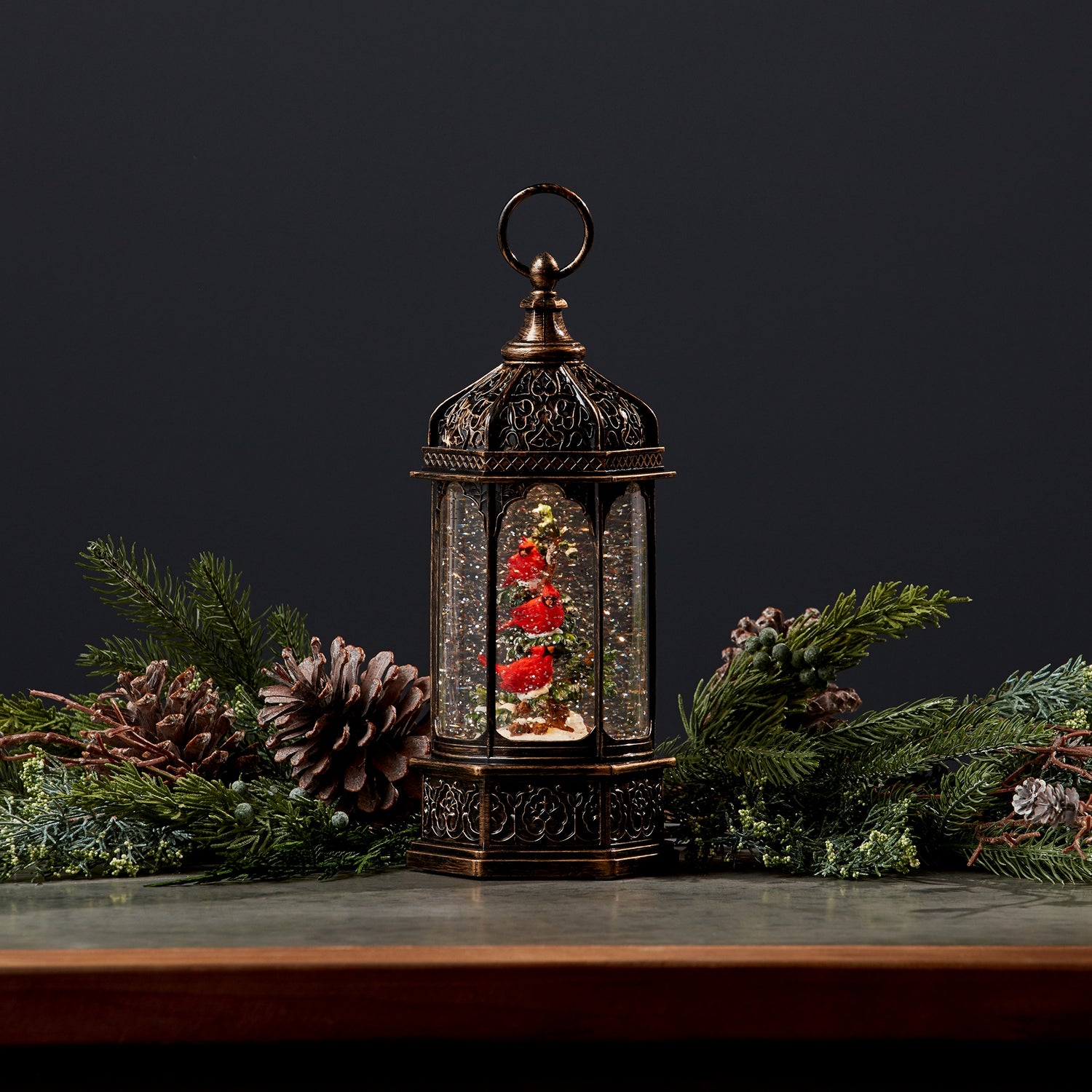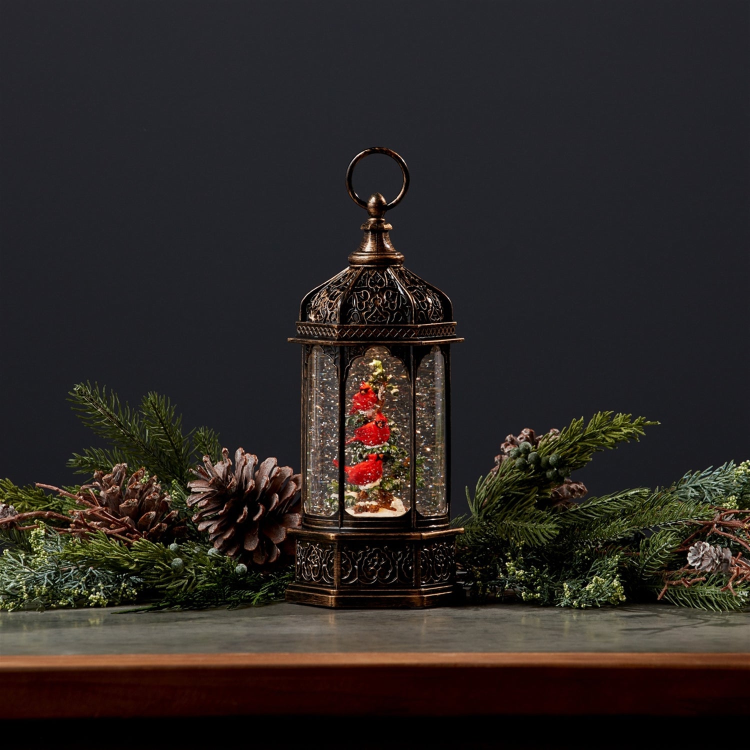Illuminate your home this Christmas season with the stunning Lighted Lantern Snow Globe with Santa accent. This piece features cardinal birds resting on a pine branch inside of a lantern-shaped snow globe. The ornate lantern design paired with the sparkley globe contents makes this set a great addition to any style of holiday decor. The piece also includes a 6-hour timer function. Requires 3 AA Batteries (not included).