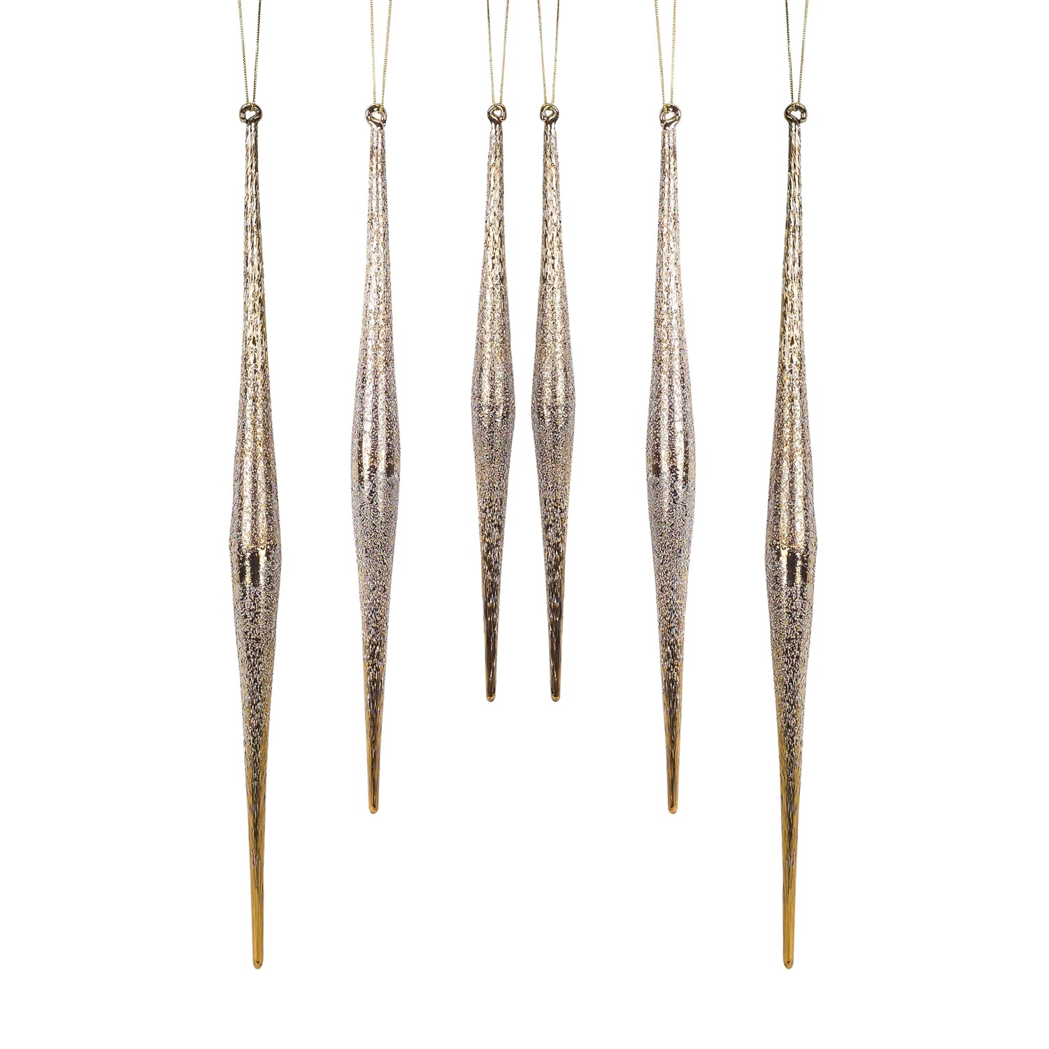 Adorn your Christmas Tree with this beautiful set of Icicle Ornaments. Featuring three assorted sizes and six total pieces, the modern icicle design paired with the chic gold and silver finish makes this piece the perfect addition to your holiday tree decor. They can be used as Christmas gifts for friends to cherish, or you can display the set on your own tree and enjoy them for years to come.