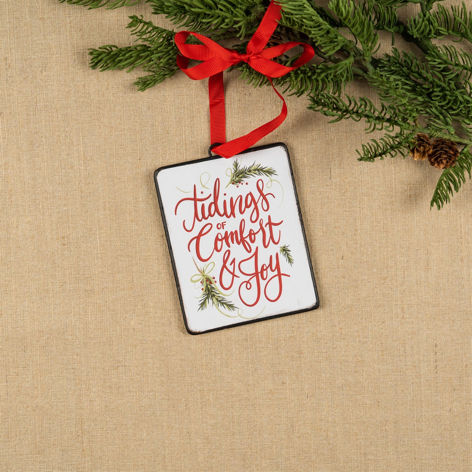 Adorn your Christmas tree with this beautiful set of Holiday Sentiment Ornaments. Featuring the sentiments "Joy to the World" and "Tidings of Comfort and Joy", the festive red and white tones paired with the elegant cursive font design and pine branch accents is the perfect combination to create a memorable display. The quality iron metal composition with delicate ribbon tie hanger is sure to endure for seasons to come. Whether you're adding a touch of cheer to your home or gifting to a loved one, these ornaments will definitely bring smiles to your home.