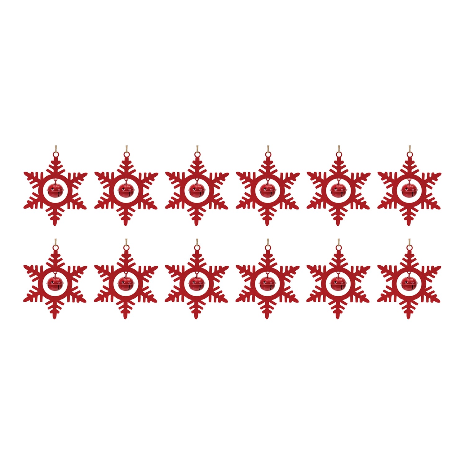 Add a traditional touch to your Christmas Tree with this beautiful set of Metal Snowflake with Bell Ornaments. Featuring 12 pieces, this set's festive red tones, traditional snowflake design, and hanging sleigh bell accents are the perfect combination to create a memorable display. The quality iron metal composition with delicate jute string hanger is sure to endure for seasons to come. Whether you're adding a touch of cheer to your home or gifting to a loved one, these ornaments will definitely bring smiles to your home.