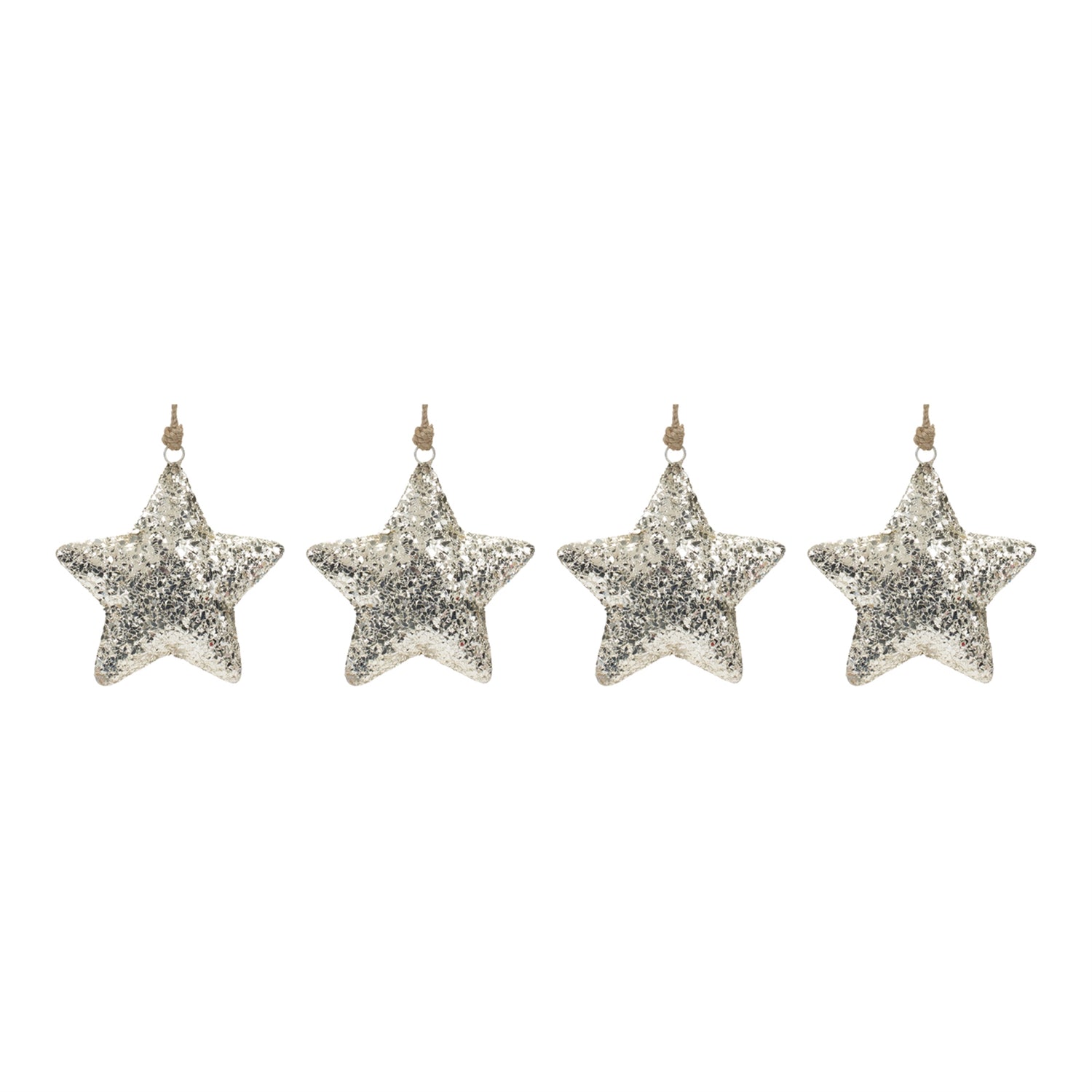 Add a chic touch to your Christmas Tree with this beautiful set of Mosaic Metal Star Ornaments. Featuring 4 pieces, this set's chic silver tones, traditional star shape, and mosaic glass design are the perfect combination to create a memorable display. The quality iron metal composition with rustic jute string hanger is sure to endure for seasons to come. Whether you're adding a touch of cheer to your home or gifting to a loved one, these ornaments will definitely bring smiles to your home.