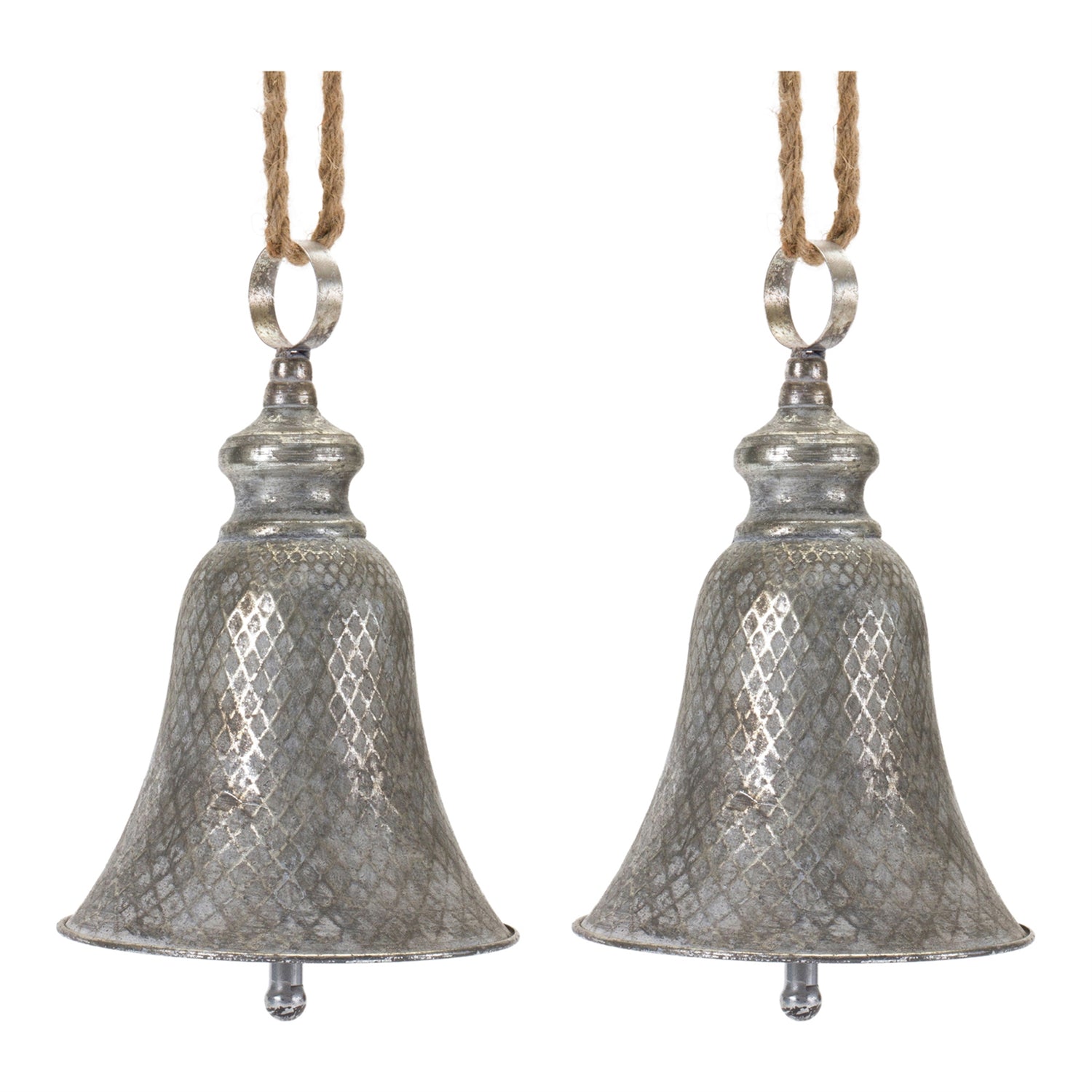 Add a rustic touch to your Christmas Tree with this beautiful set of Metal Bell Ornaments. Featuring two pieces, this set's distressed silver metal finish, traditional bell design, and Harlequin patterned accent are the perfect combination to create a memorable display. The quality metal composition with jute rope hanger is sure to endure for seasons to come. Whether you're adding a touch of cheer to your home or gifting to a loved one, these ornaments will definitely bring smiles to your home.