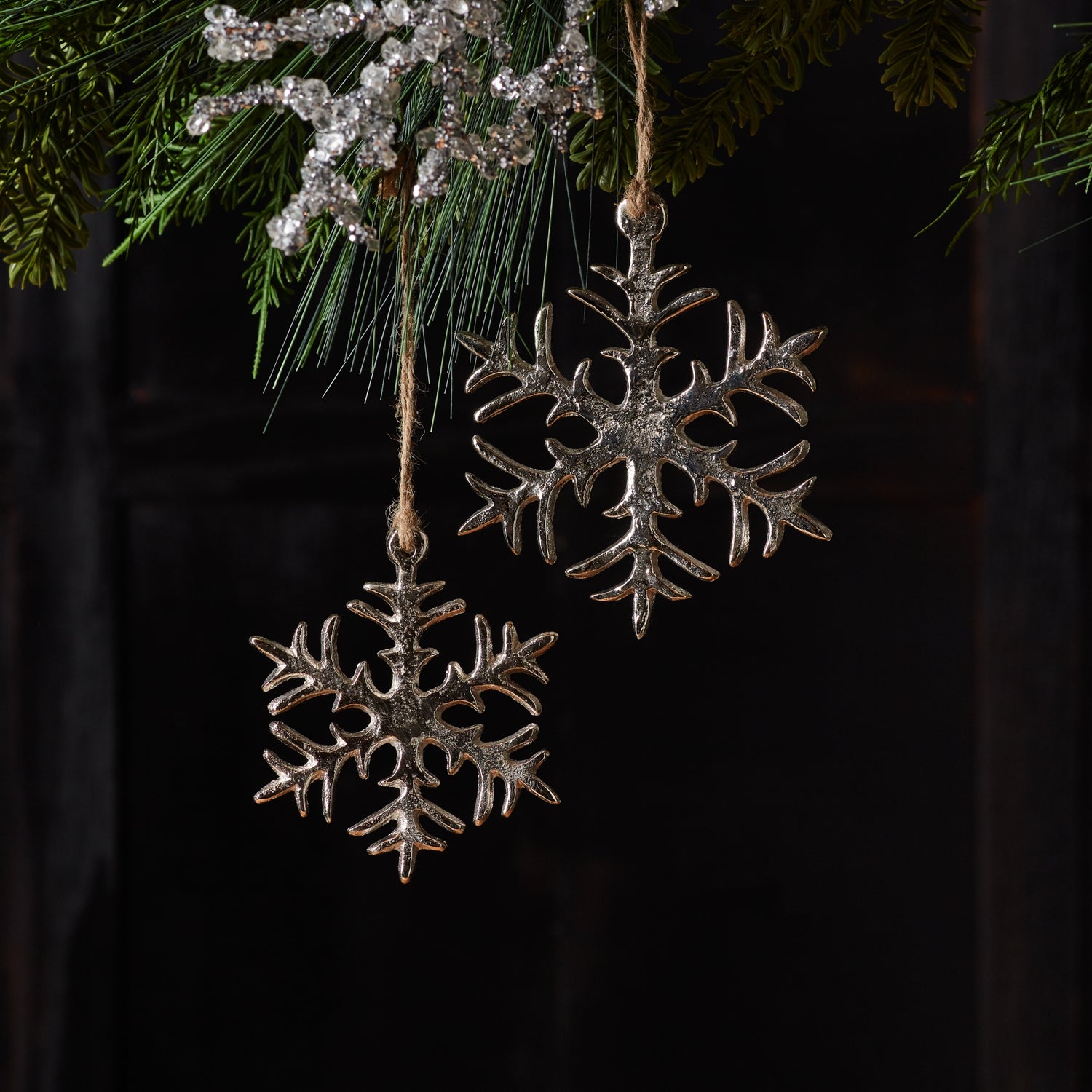 Add a woodland touch to your Christmas tree with this stunning set of Metal Snowflake Ornaments. Featuring 12 pieces and two assorted sizes, the rustic disressed metal finish paired with the traditional snowflake design are the perfect combination to create a memorable dipslay. The quality aluminum metal composition with natural jute string hanger is sure to endure for seasons to come. Whether you're adding a touch of cheer to your home or gifting to a loved one, these ornaments will definitely bring holiday spirit to your home.