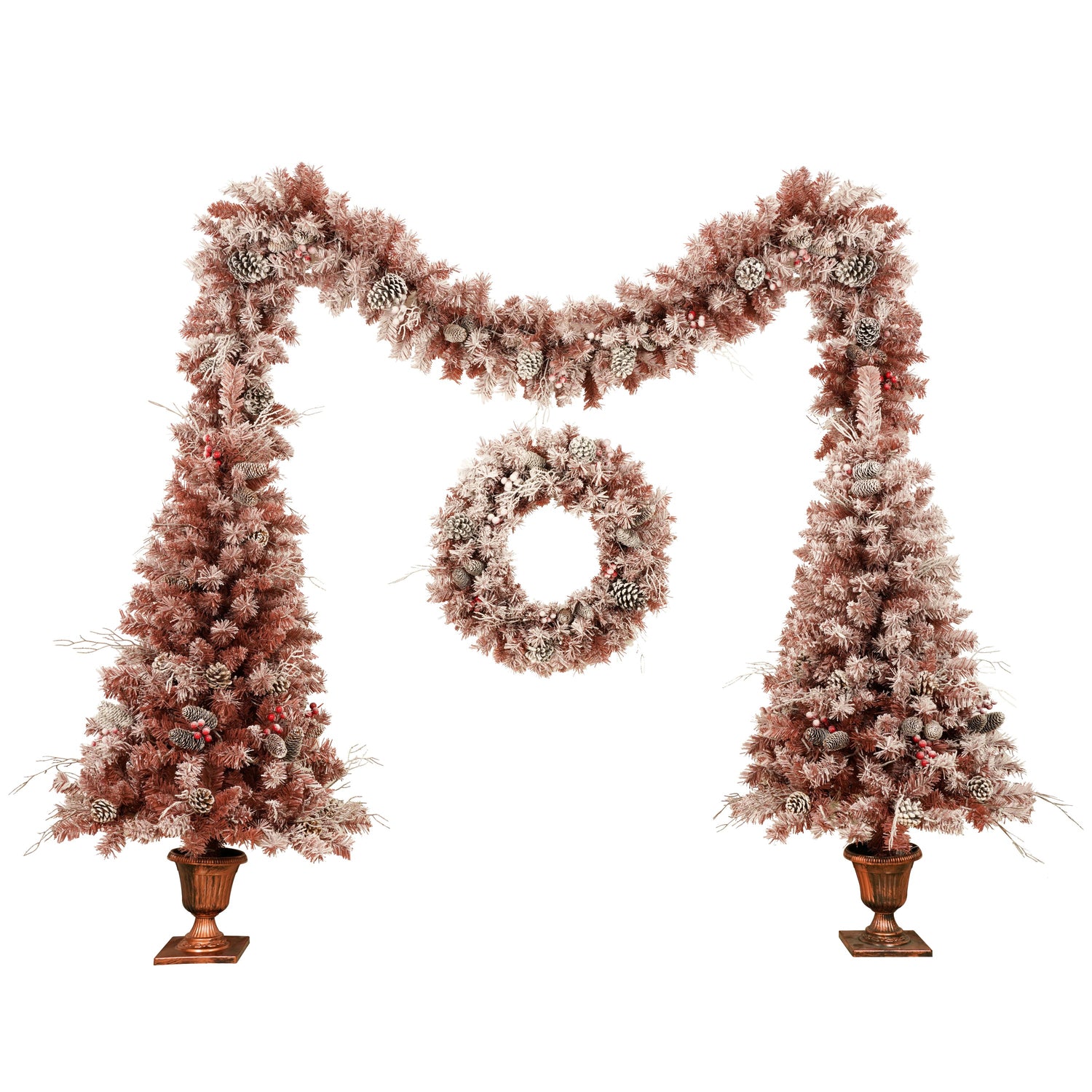 Set Includes: Two pre-lit Christmas trees, one wreath, one garland