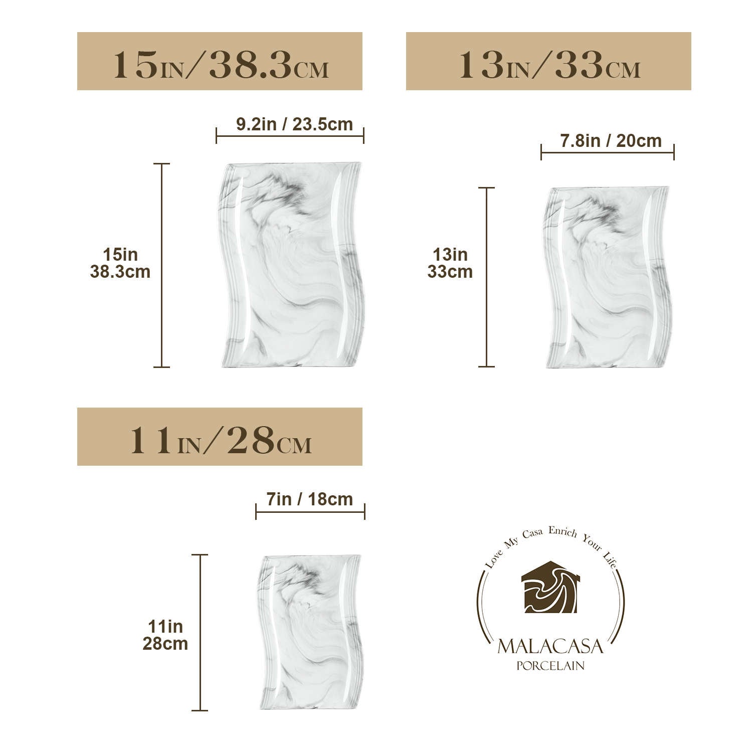 - Fine porcelain wavy-shaped rectangular plates, set of 3, ivory white/marble grey
