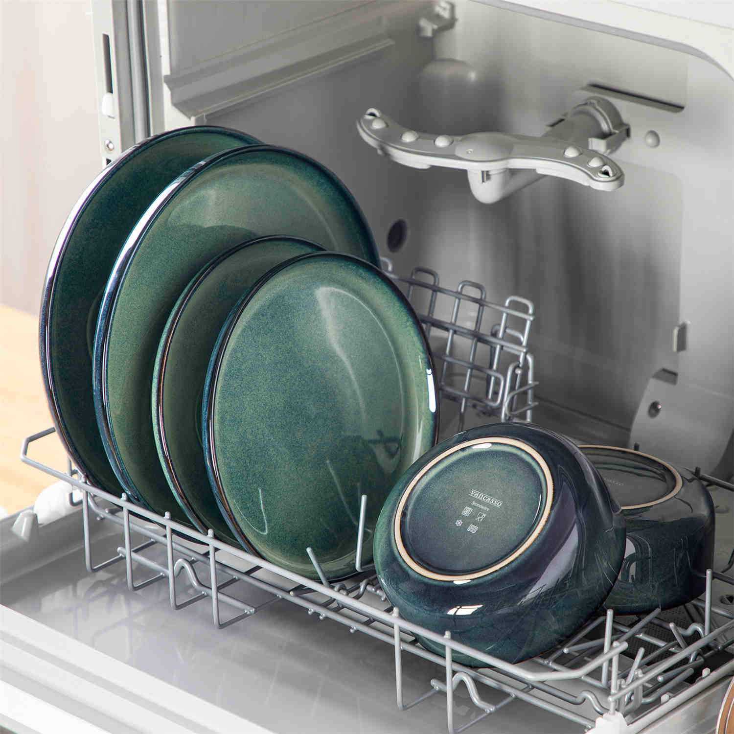 This dinnerware set captures the charm of the cosmos with its sleek lipped edge and radiant reactive glaze. Available in two captivating hues—deep starry blue and serene teal—the collection offers a refined yet versatile design that suits both casual meals and special gatherings. Crafted from durable stoneware, each piece is smooth to the touch and safe for the microwave, oven, and dishwasher. The set includes dinner plates, salad plates, and cereal bowls for six, all stackable for easy storage and perfect for elevating everyday dining with effortless elegance.