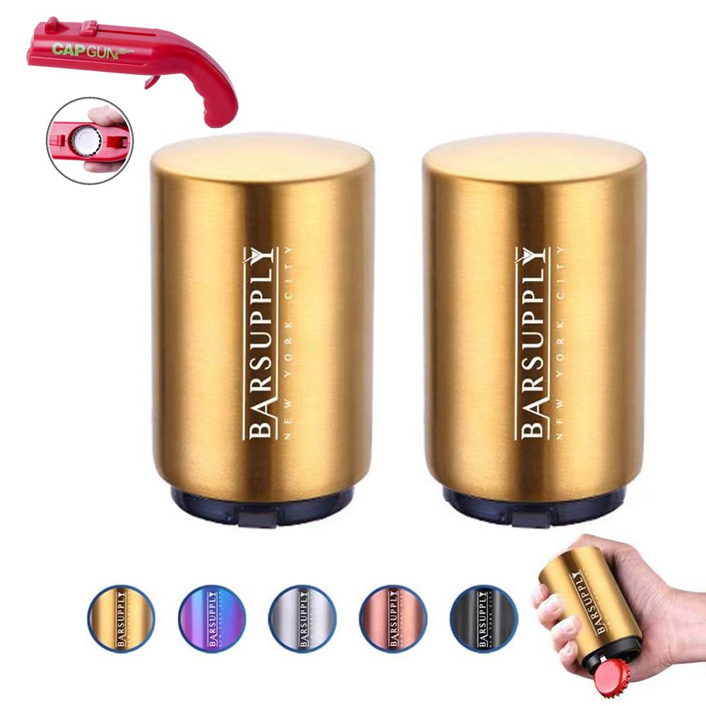 Enjoy effortless bottle opening and a little fun on the side with this 2-Pack Push Down Automatic Magnetic Beer Bottle Opener + BONUS Cap Gun. These sleek stainless steel openers feature an easy push-down design that pops caps off instantly while the built-in magnet securely catches them. Perfect for home bars, parties, BBQs, and gifting, this set adds both style and convenience to every gathering.