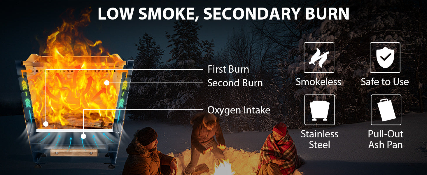 - Efficient & Smokeless: Scientific internal airflow system and double-wall design, as well as top vents for oxygen to feed the fire from below, our smokeless fire pit achieves secondary combustion of fuel and low-smoke heating. Burning up to 85% more efficiently than other stoves, this fire pit makes it easy to meet your heating needs in a cleaner environment.