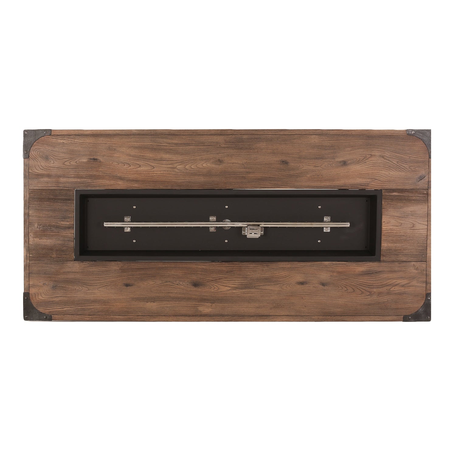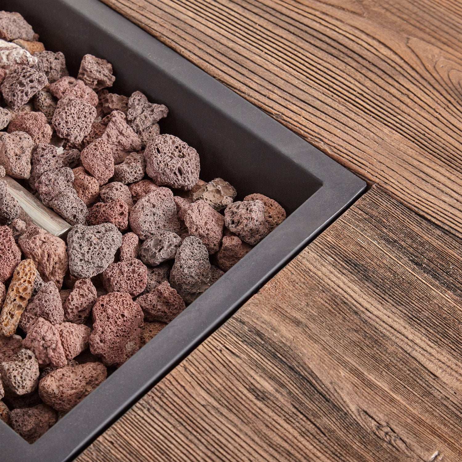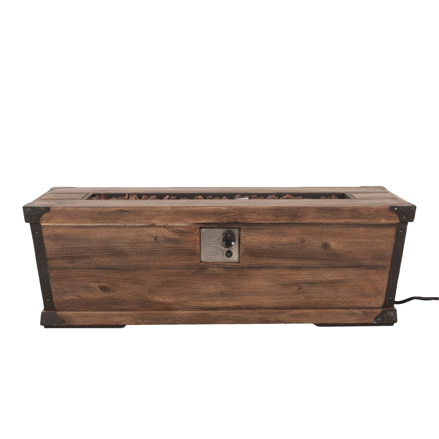 This 56-inch rectangular gas fire pit is designed for outdoor patios and garden spaces, providing both warmth and a rustic wood-patterned aesthetic to enhance your outdoor living area.