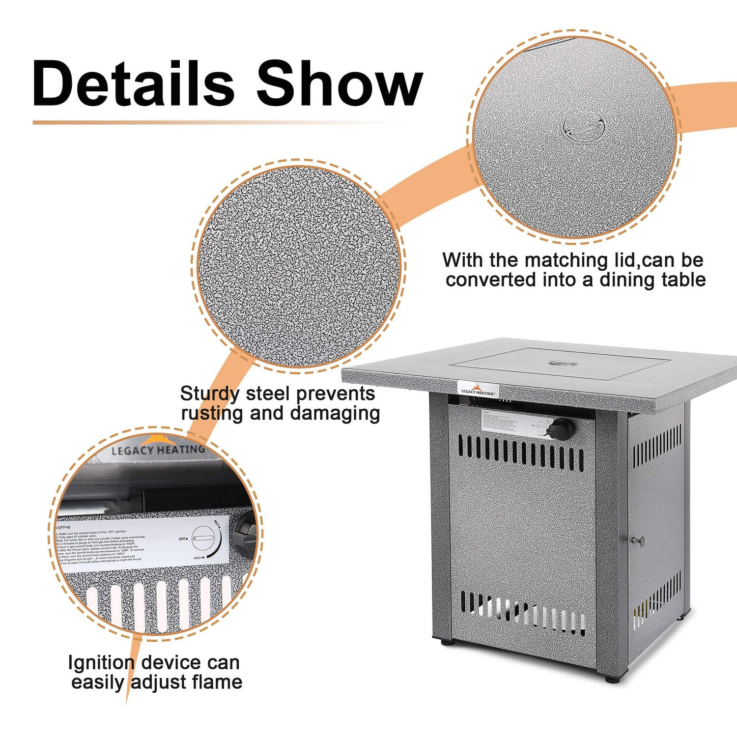 28" 50000 BTU Silver Outdoor Propane Gas Fire Pit Table, Outside Patio Firepits Fireplace Dinning Tables with Lid & Lava Rock, 2-in-1 Firepit Table for Courtyard/Patio/BalconySpecifications