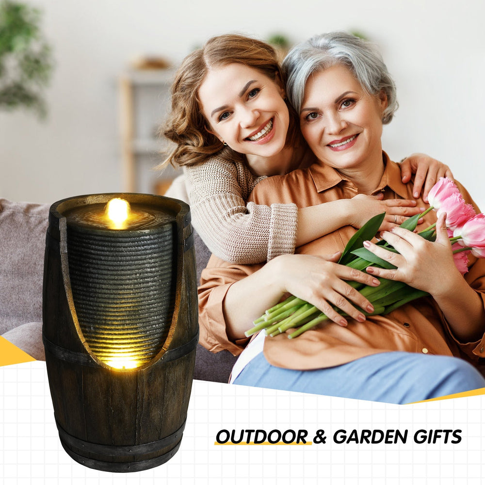 Wooden Barrel Style Outdoor Water Fountain with Lights Resin Rustic Garden Waterfall Decor for Patio Porch Yard