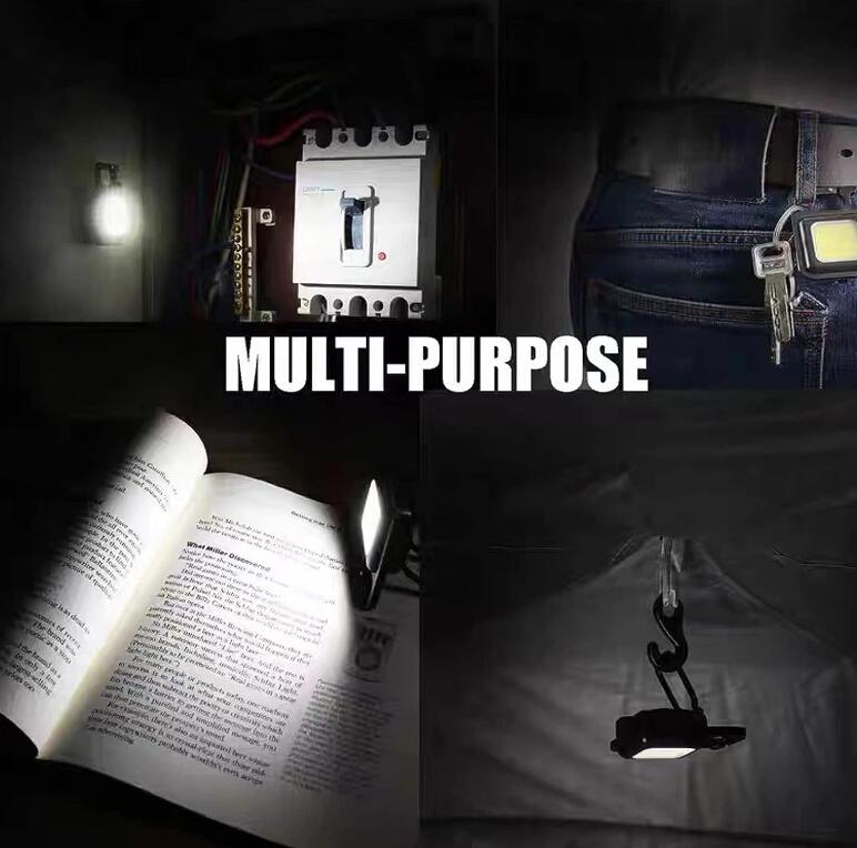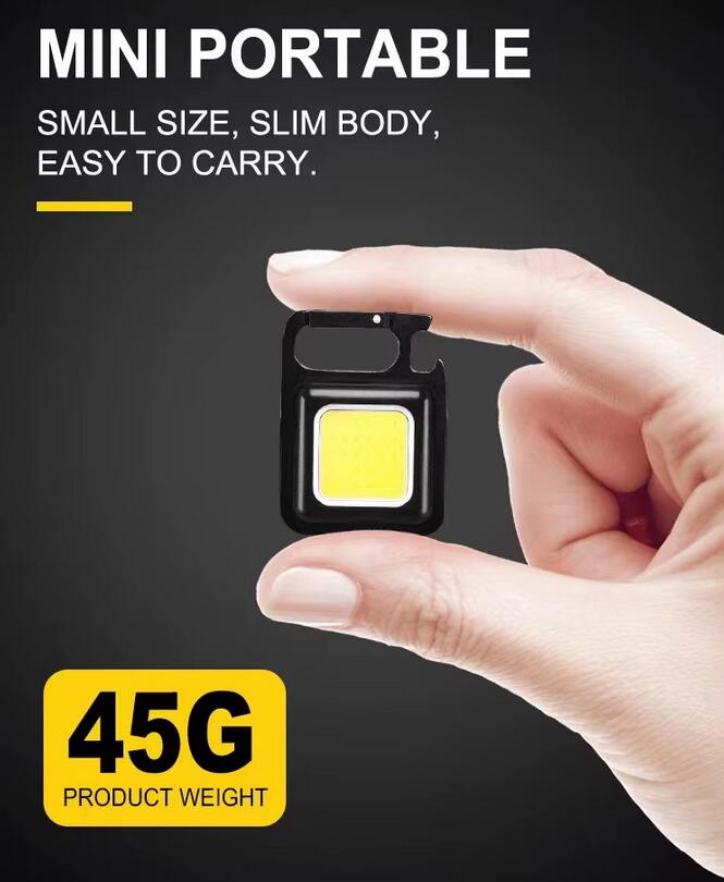 This compact rechargeable keychain flashlight packs serious power in a pocket-sized design. Equipped with a 500mAh battery and USB-C charging, it delivers up to 800 lumens of bright COB lighting. Each set includes two mini work lights, two charging cables, and an instruction manual. With four lighting modes—including high, medium, low, and strobe—plus a long-press ultra-bright option, it adapts to your every need. The 180° foldable stand, strong magnetic base, and built-in hook offer true hands-free convenience, and it even doubles as a bottle opener. Built from durable aluminum alloy and PC material, it’s both water- and impact-resistant, making it the ultimate EDC light for camping, fishing, walking, or emergency repairs.