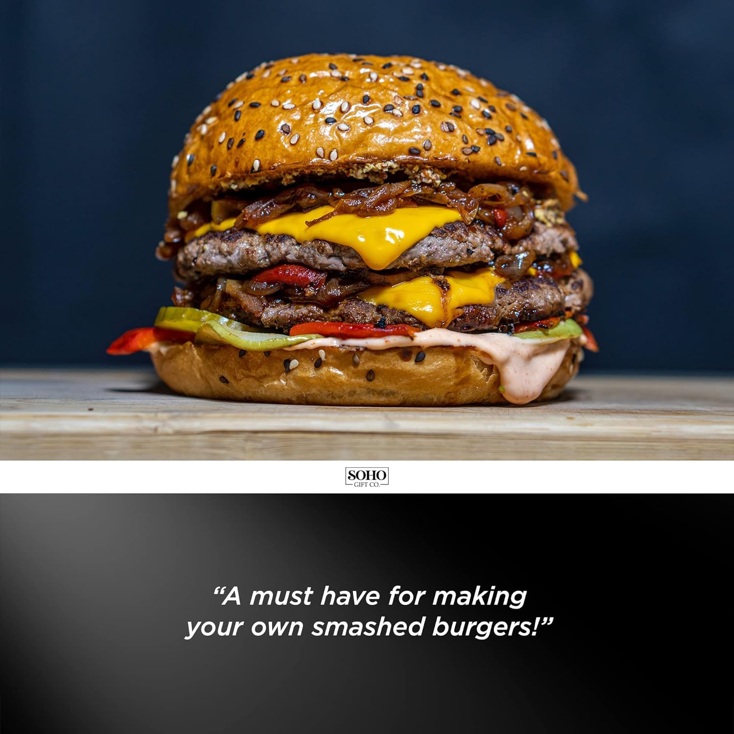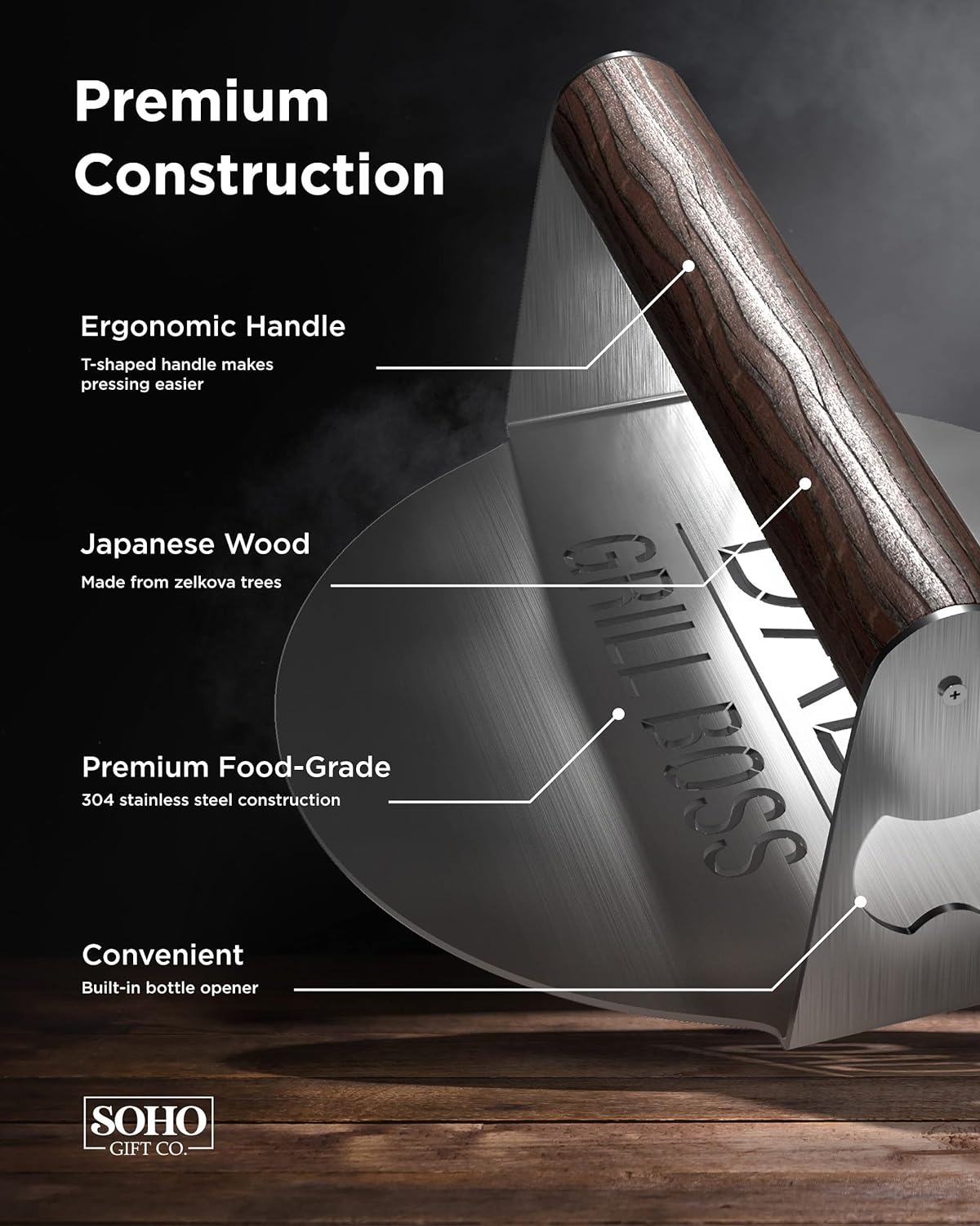 • Made of premium engraved stainless steel with an ergonomic wood handle and a convenient built-in bottle opener. The grill press is a must have for smashed burgers lovers: get the ultimate crispy edges and a flavorful, well-browned crust.