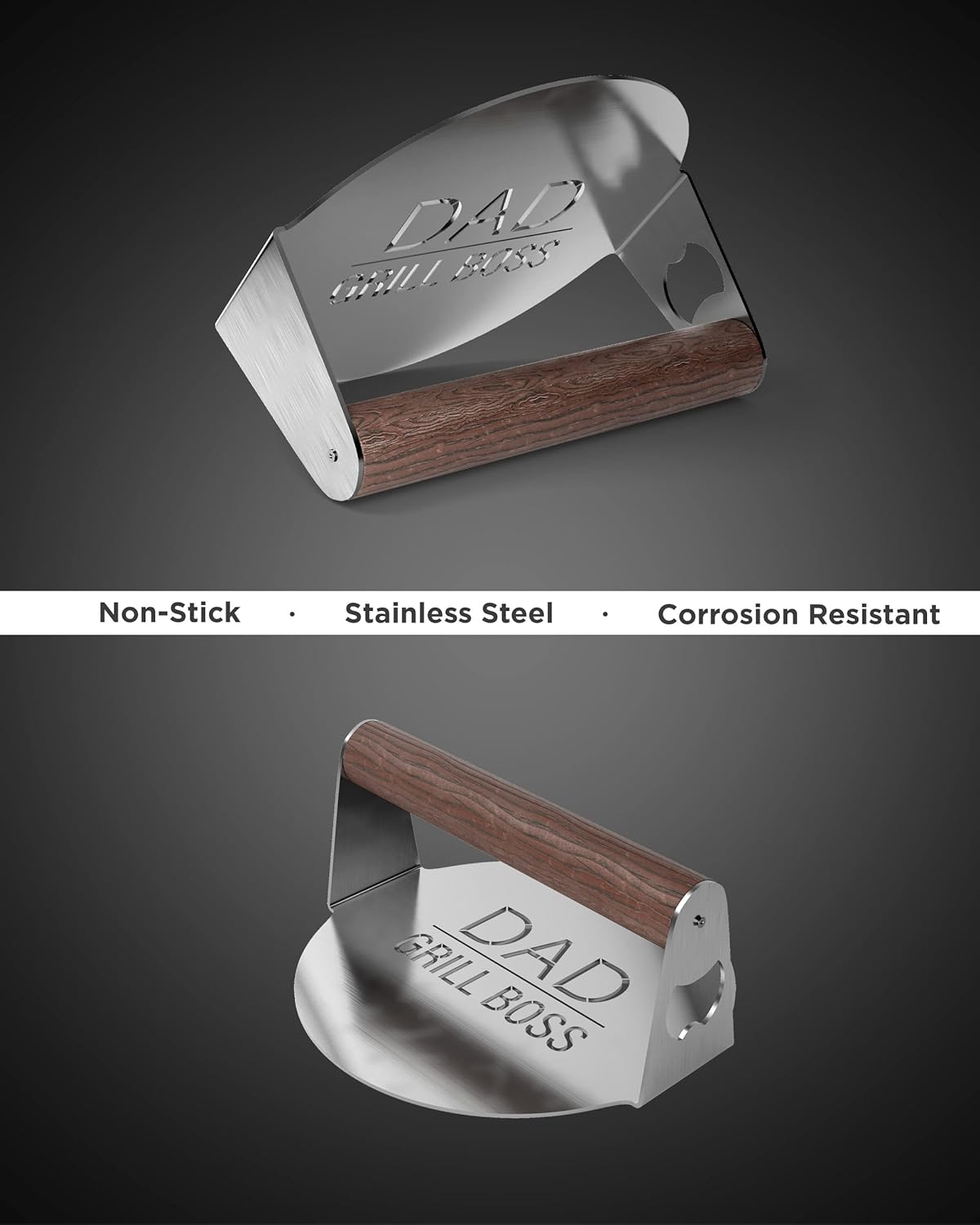 BBQ Press Grilling Gift for DAD The Grill Boss - Stainless Steel Smash Burger Press for Hamburger/Bacon with Wood Handle & Beer Opener (for Christmas, Birthday, Fathers Day)