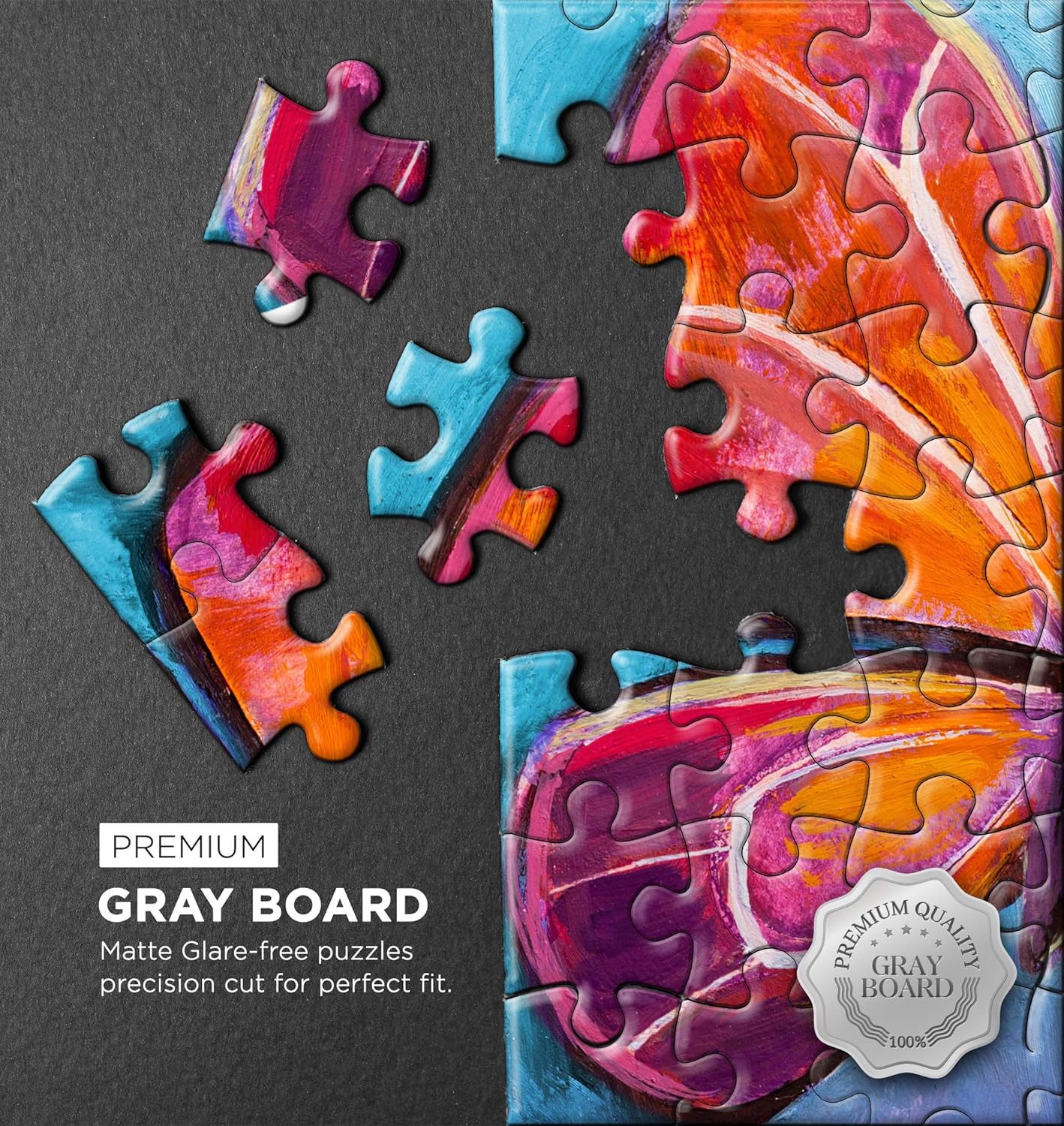 1000 Pieces Square Jigsaw Puzzle_Butterfly Premium Grey Board Assembled size: 27x27 inch Alphabet zoning partition: different sections are divided with letters on the back of the puzzle so you could look for hints when needed Each set comes with permanent puzzle saver sheets and hooks for wall hanging