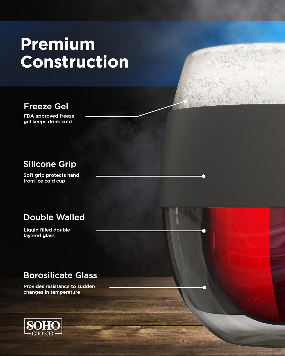 • Double walled glass with built-in freezer gel turns her favorite beverage into an ice cold drink in seconds (Recommended freeze time: 3+ hours)