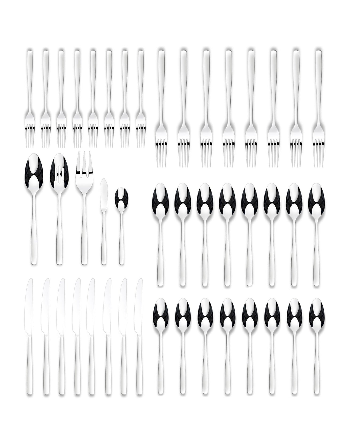 Service for 4: Includes 4 each – salad forks, dinner forks, dinner knives, dinner spoons, and teaspoons