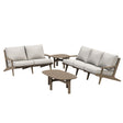 Refresh your outdoor space with the Saratoga 4-Piece Patio Furniture Set. Expertly crafted from durable teak wood with a water-based finish that highlights its natural grain, this backyard furniture set includes a sofa, loveseat, side table and coffee table. The sofa and loveseat feature an angular frame with sculpted armrests, slatted seat foundations, and plush seat and back cushions covered in weather-resistant, water-resistant, and stain-resistant fabric for easy maintenance and year-round relaxation. The coffee and side tables boast beautifully slatted tops with intersecting stretcher bases, offering both durability and a refined silhouette. Perfect for patios, and outdoor lounge areas, the Saratoga 4 Piece Patio Set blends modern design with timeless craftsmanship. Assembly required.