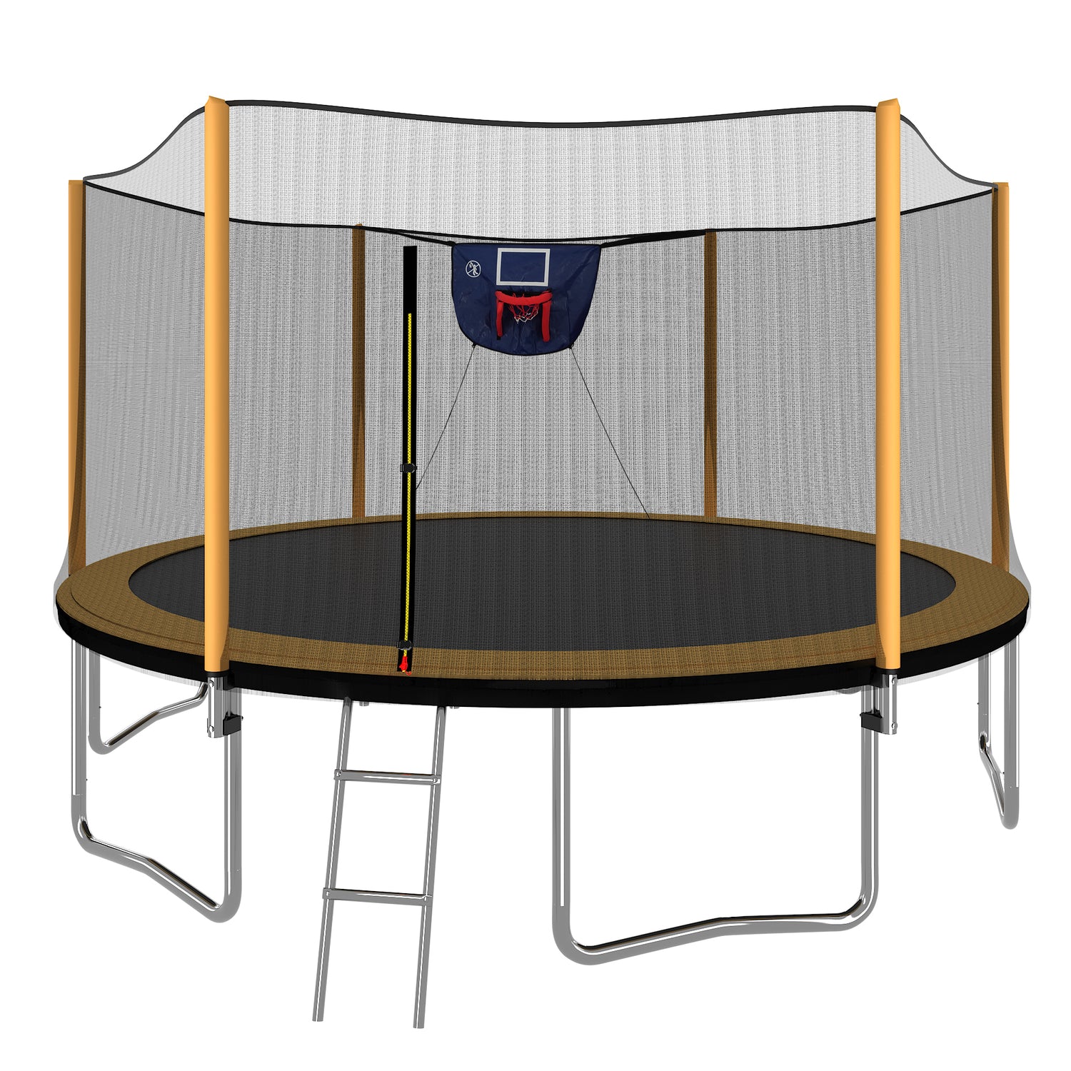 14ft powder-coated advanced trampoline with basketball hoop inflator and ladder(outer safety enclosure) orange
