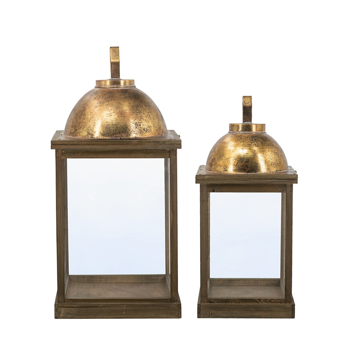 Set of 2 Brown Wooden Lanterns with Clear Glass Panels and Gold Metal Dome Accents, L:14x14x28.5' S:11x11x23'