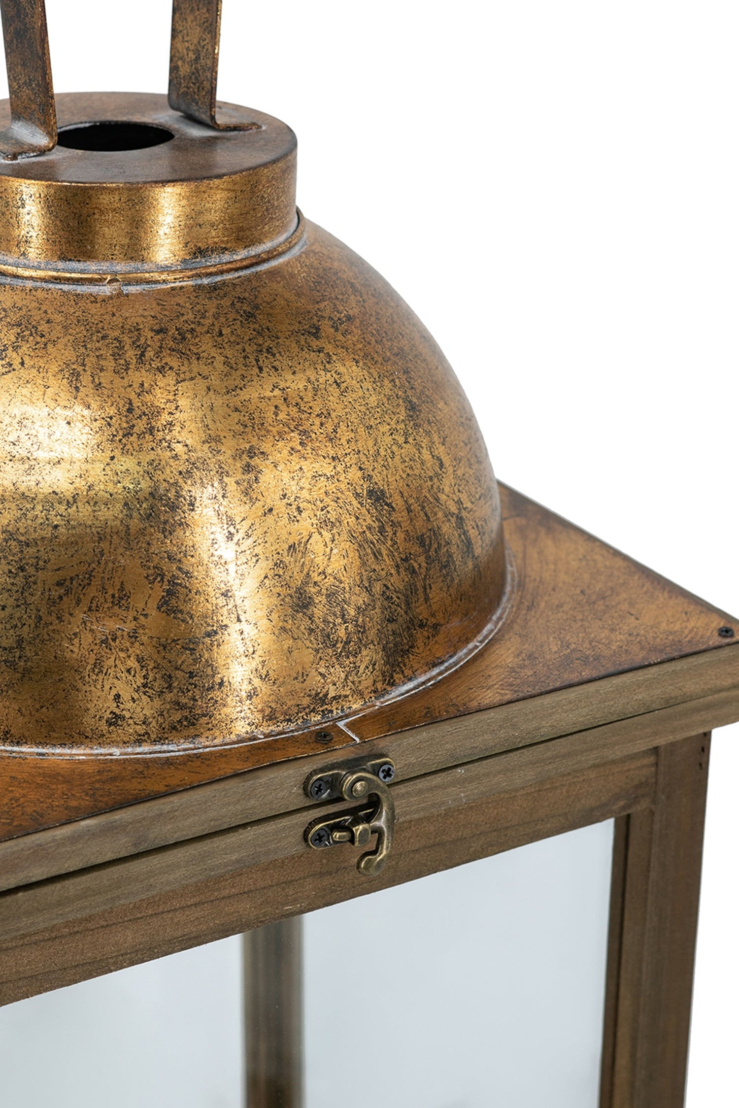 - Inspired by the timeless charm of vintage design, each lantern offers a unique twist on the classic rectangular silhouette, featuring a warm brown frame, clear glass panels, and a gold metal dome.