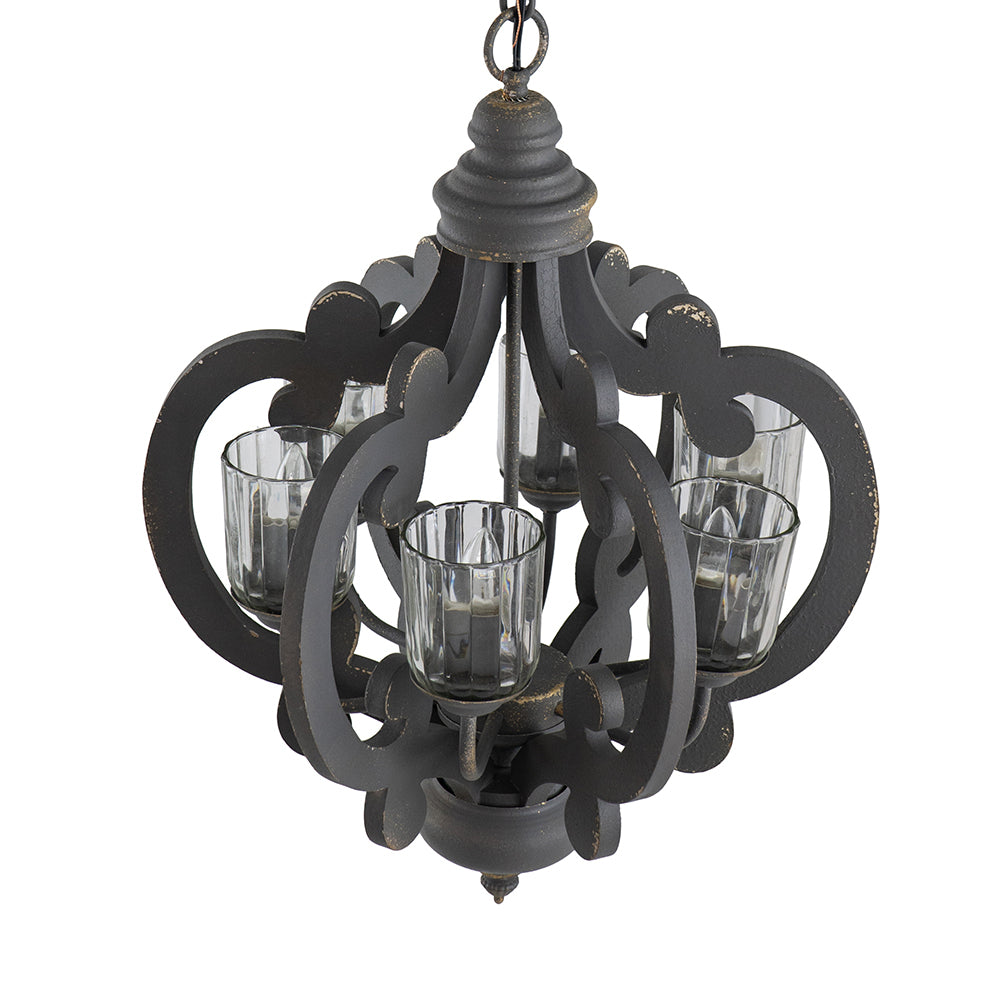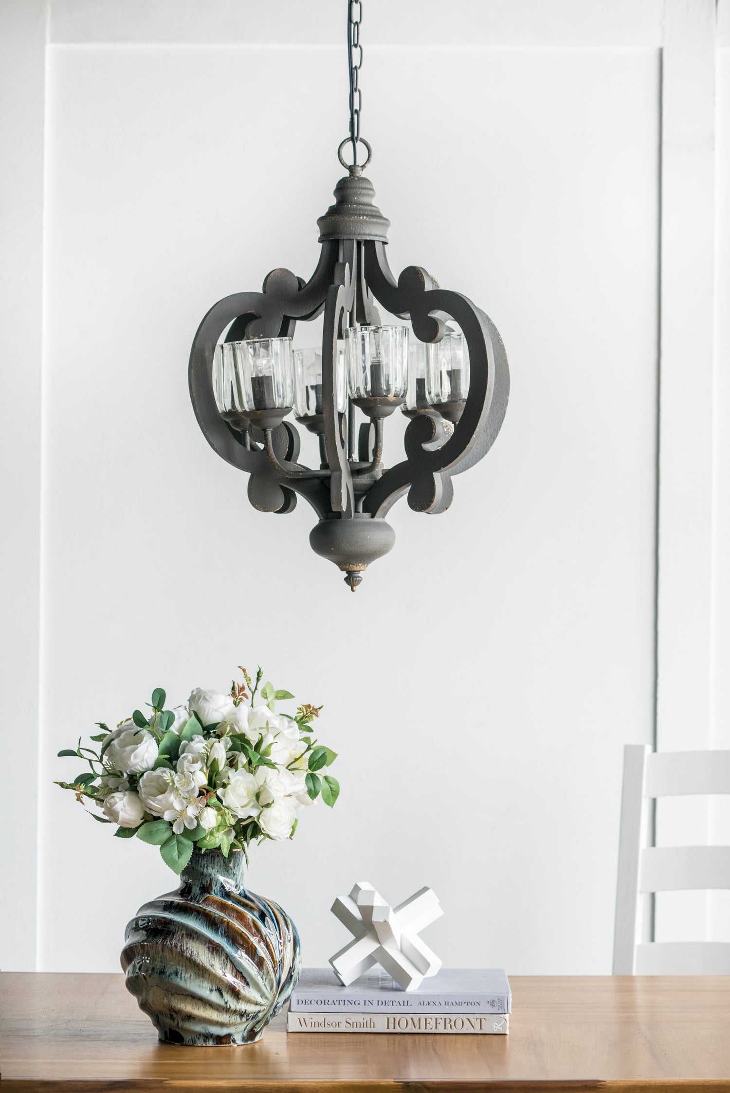 With an intricate design, charcoal gray finish, and glass bulb covers, the 6-Light Chandelier radiates warm light in timeless, sophisticated style. Classic curves and neutral color combine to make this piece a versatile, eye-catching light fixture. Let this piece bring a vintage appeal to an entryway, master bathroom or dining room.