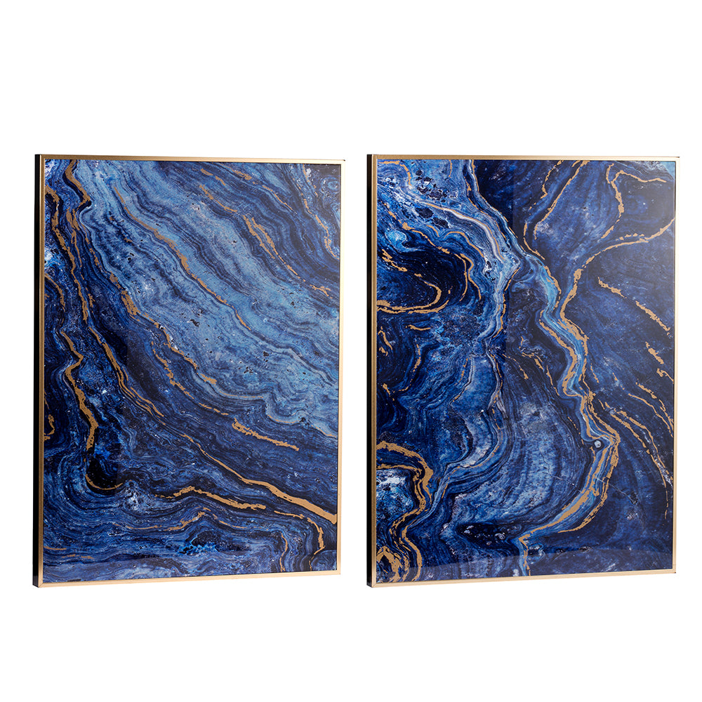 Set of 2 Blue and Gold Framed Art Panels, Unique Marbled Design, 30.5' x 40'