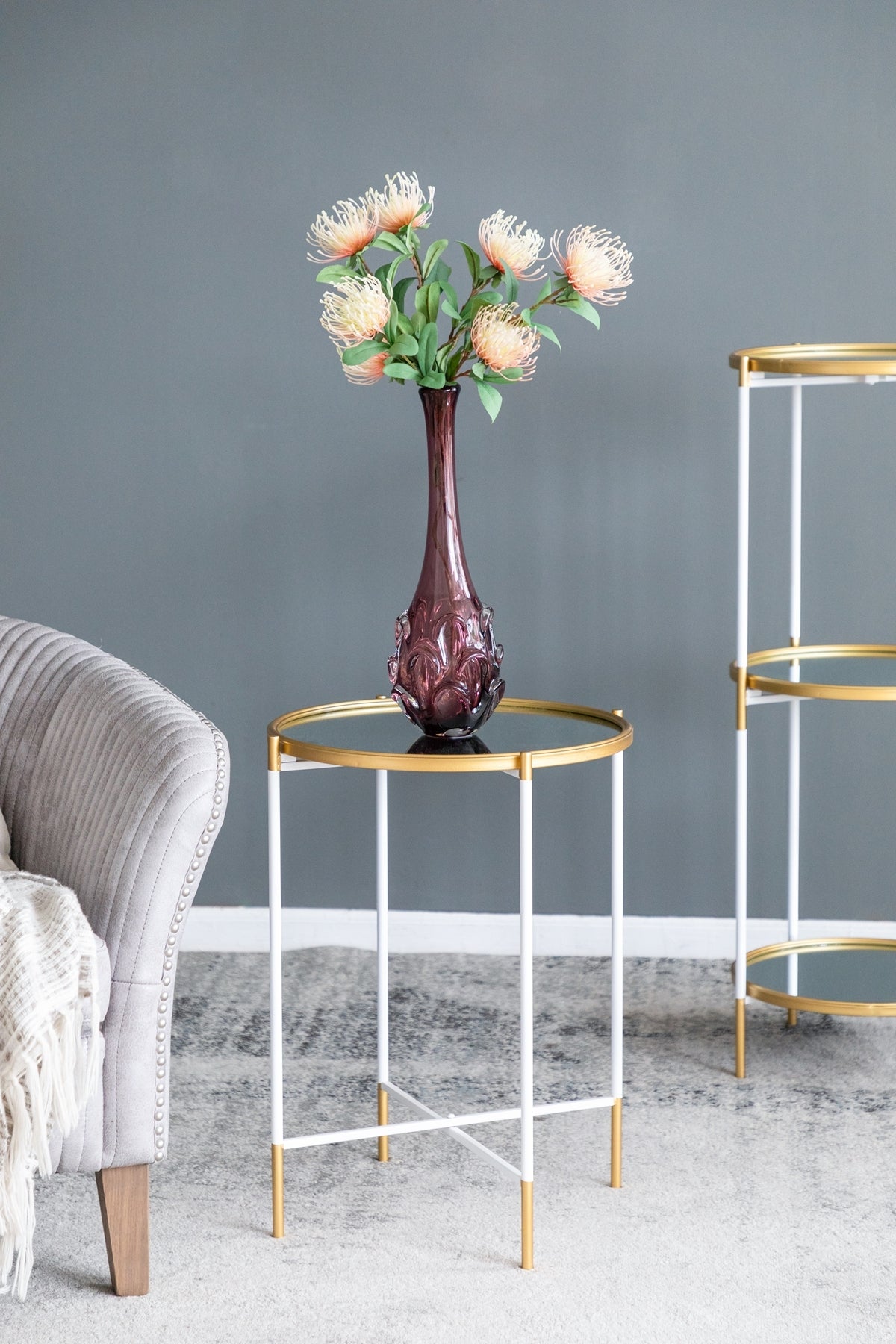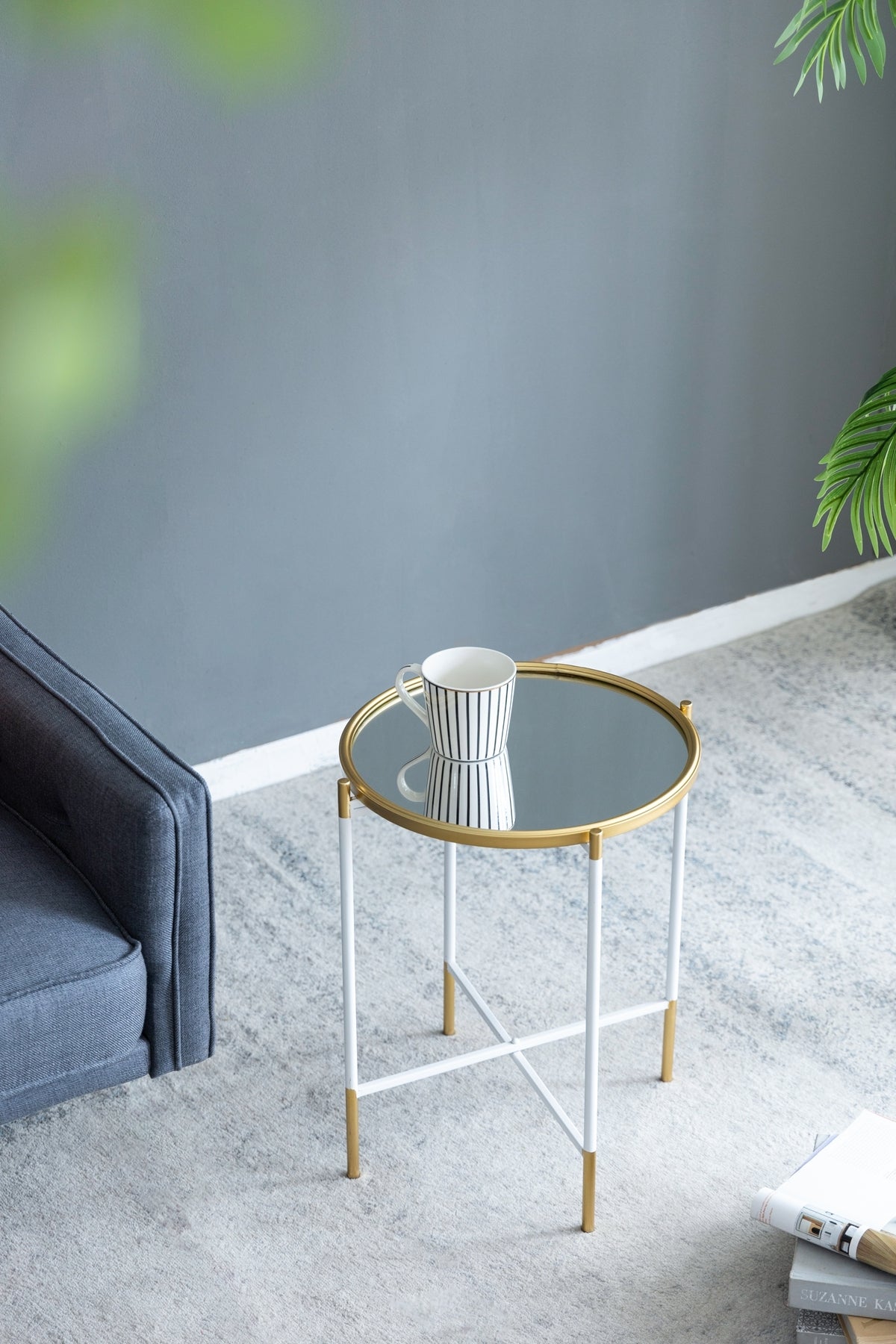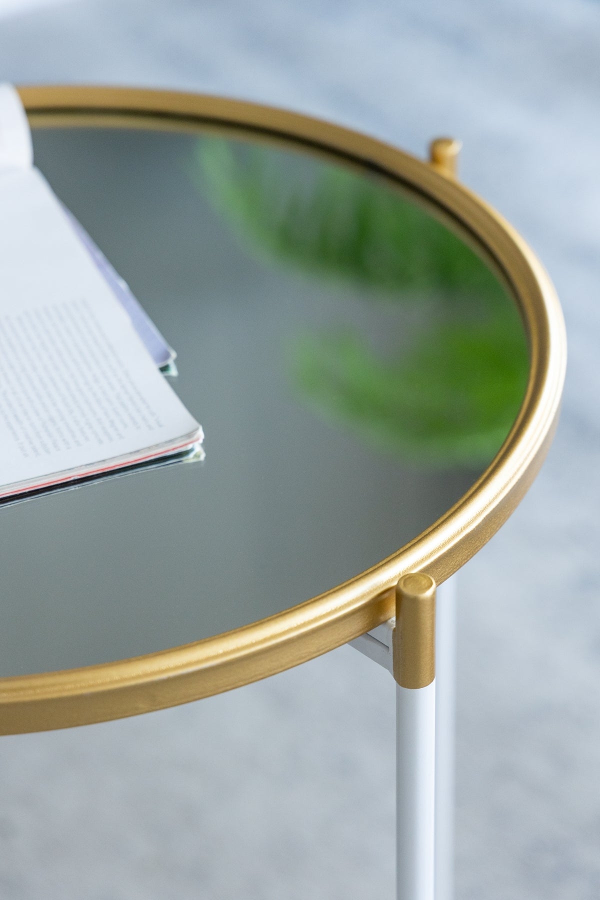- Transforming the classic round silhouette into a striking work of art, each table features an elegant mirrored top, a gleaming gold rim, and an airy white metal frame.