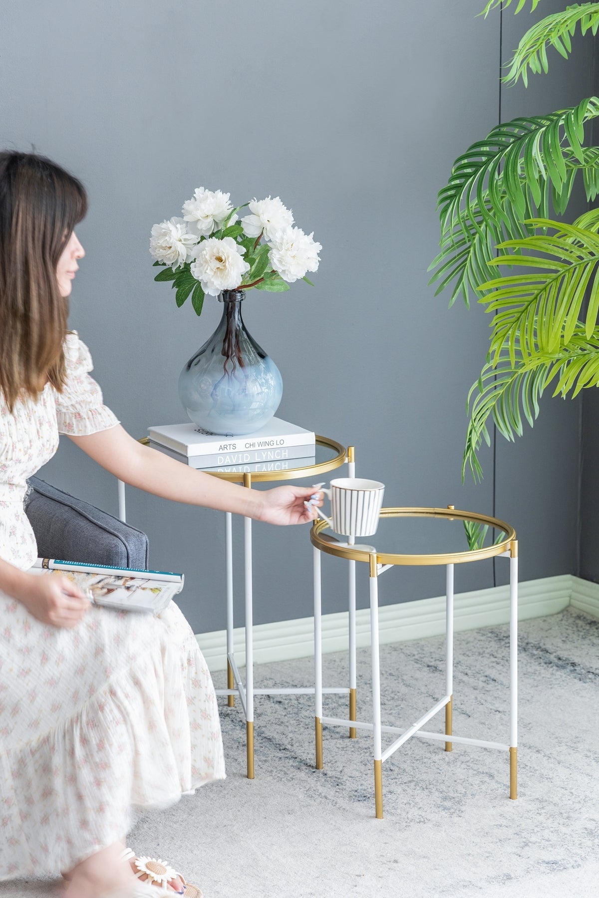 Transforming the classic round silhouette into a striking work of art, each table features an elegant mirrored top, a gleaming gold rim, and an airy white metal frame. Whether used as nightstands, end tables, or display pedestals, they add graceful deco-modern charm to any room. When not in use, the convenient nesting design allows for easy, space-saving storage.