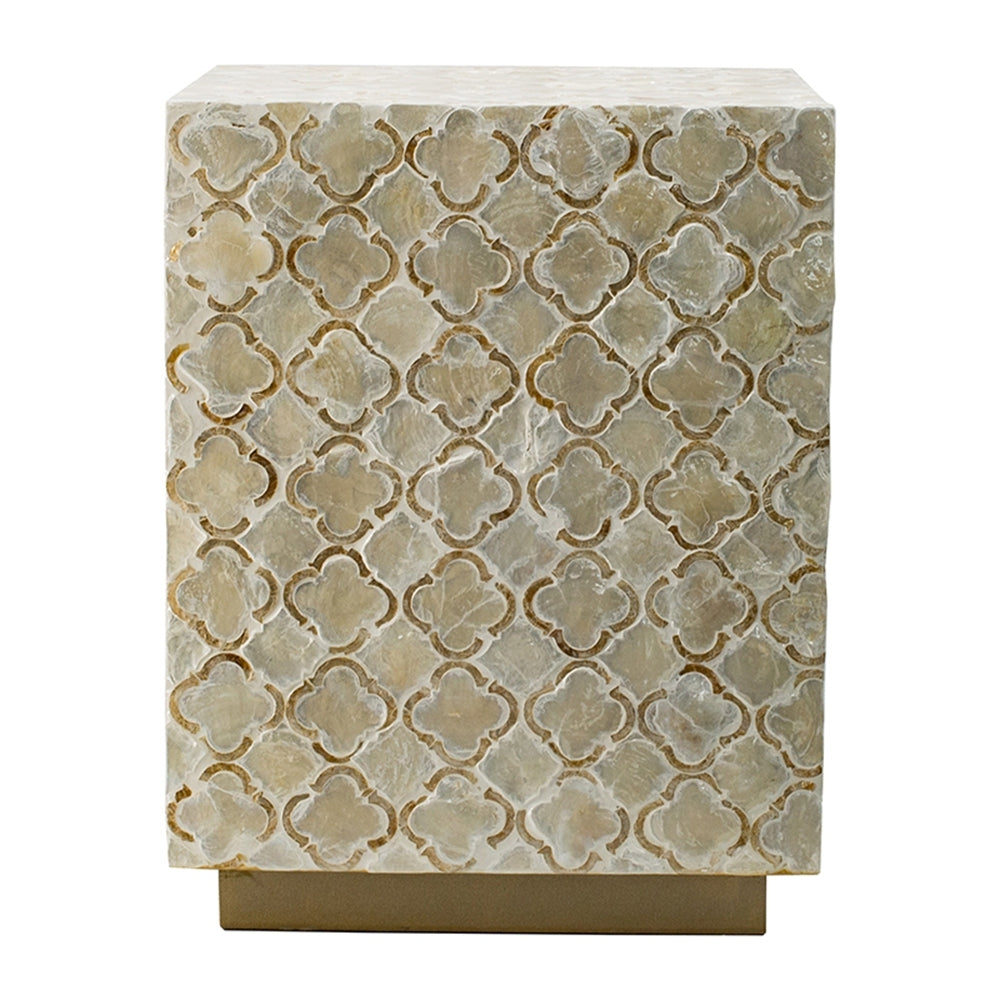 This Capiz block stool brings stylish geometry and decorative patterning to modern living spaces. The angular stool rests on a subtle brass base, providing a solid contrast to the ogee pattern on the main body. Contemporary fashion is front and center in the square design, making this piece so much more than just a functional seat.