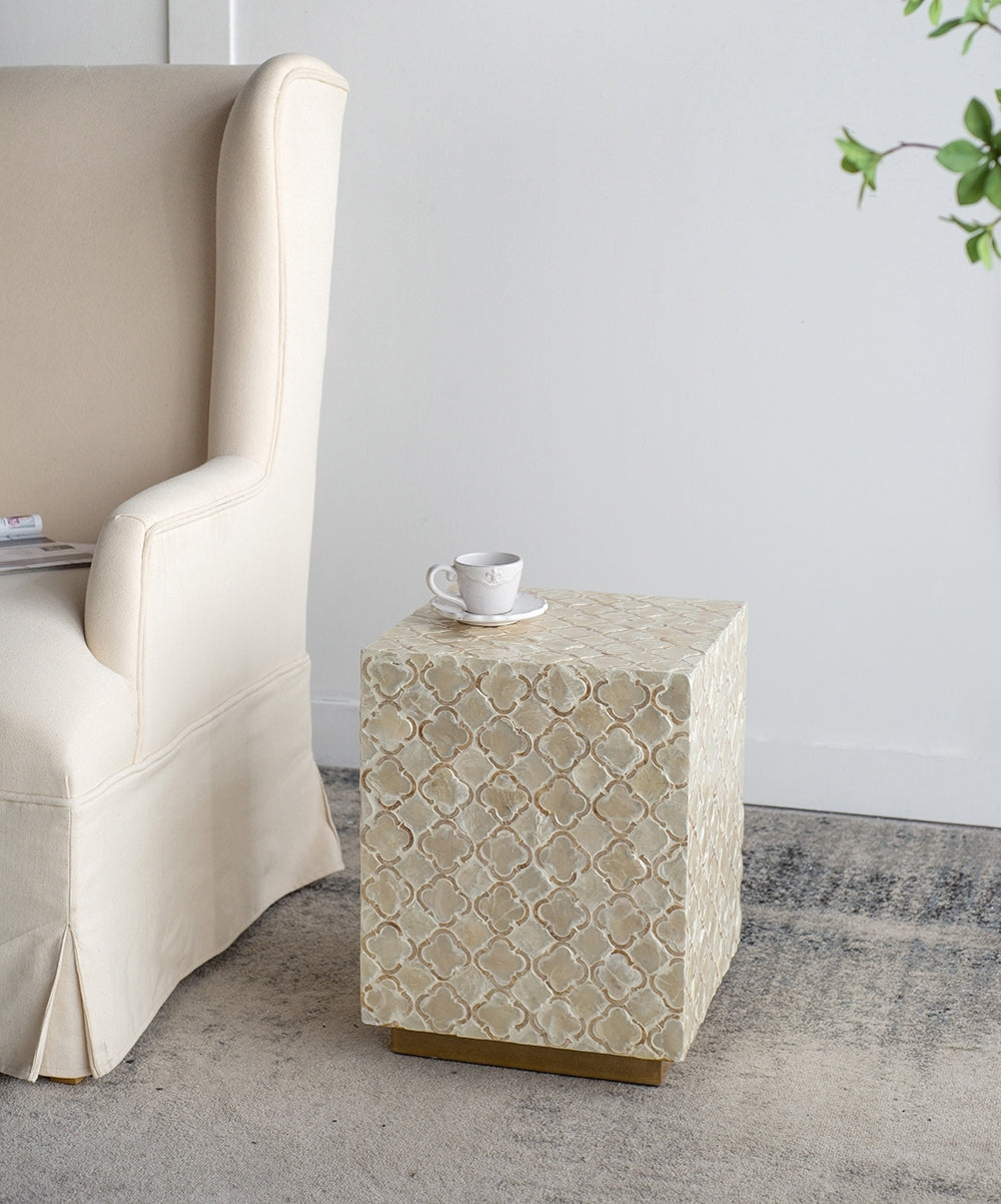 - Capiz inlay accents, Diamond shaped designs, Versatile use as a stool or side table
