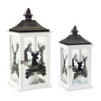 Get ready for the holiday season with this set of Christmas lanterns. The traditional black and white finish paired with the printed glass accent is the perfect combination to make a joyous piece. The deer outline with the phrase "Merry Christmas" is printed on each window pane. The sturdy wooden and metal composition is sure to last for seasons to come. Just add a real wax or LED candle to complete the look.