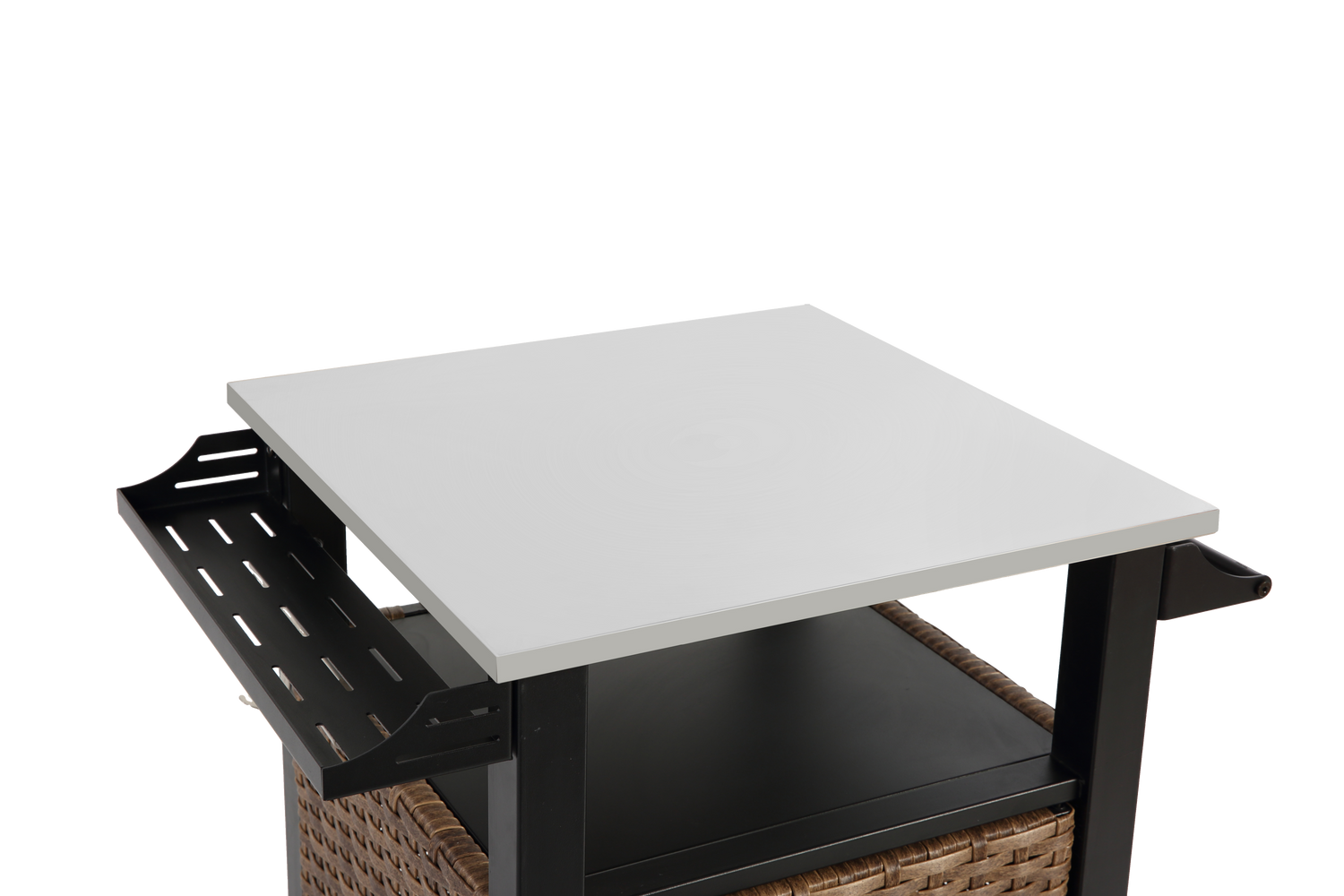 - Includes paper towel holder, bottle opener, side handle for portability, and armrests with hooks for hanging utensils or towels
