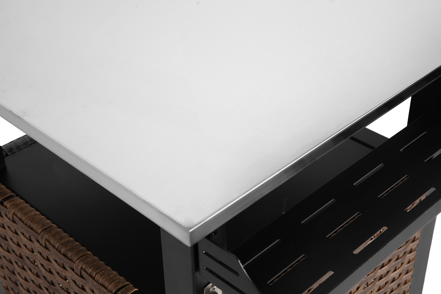 - Stainless steel tabletop with an expandable side panel for added surface area