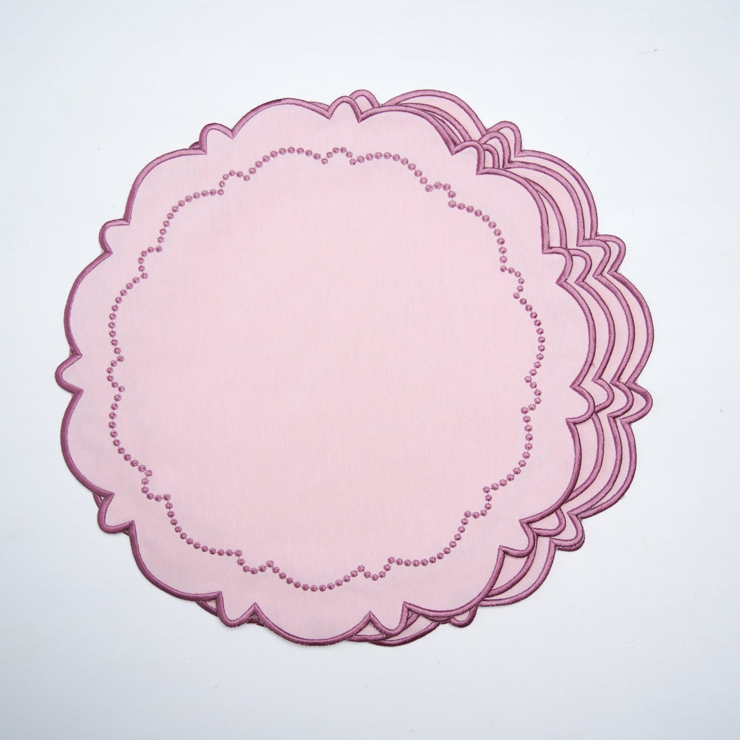 Brighten your table with the delightful Harmony Placemat. Crafted from a premium cotton blend and delicately finished with blue wavy scalloped embroidery, this design adds a touch of classic elegance to any gathering. Perfect for everyday meals or special occasions.